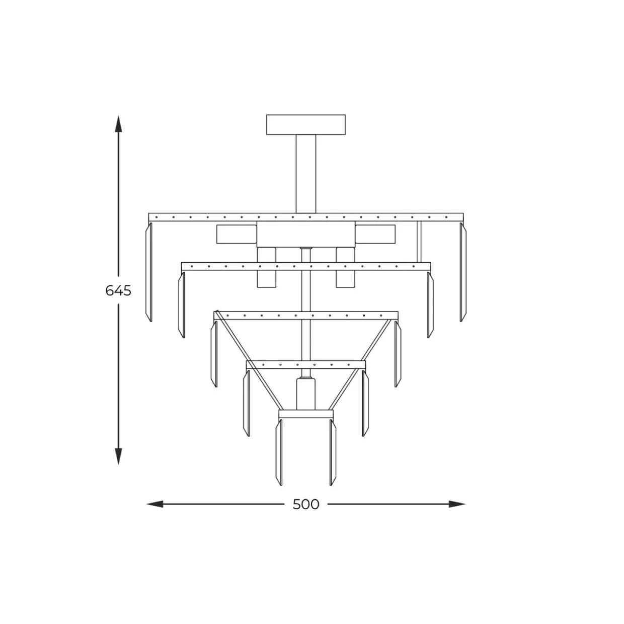 - Szklane kryształki zawieszone na metalowej podstawie uformowane są w okręgach na wzór kaskady – od największego koła do najmniejszego.
