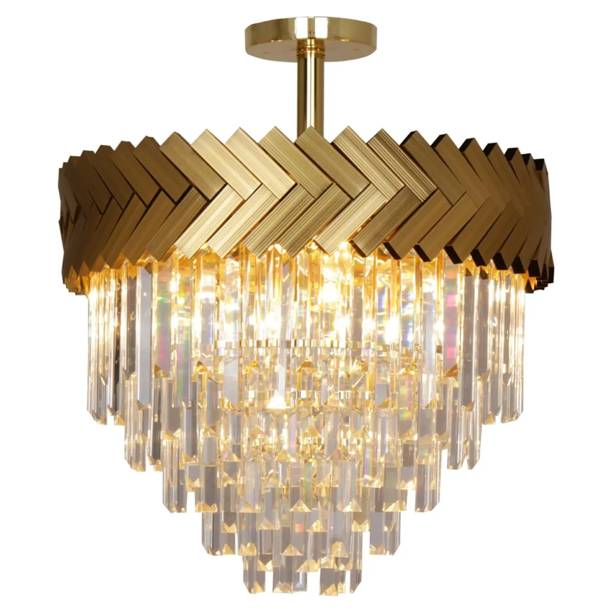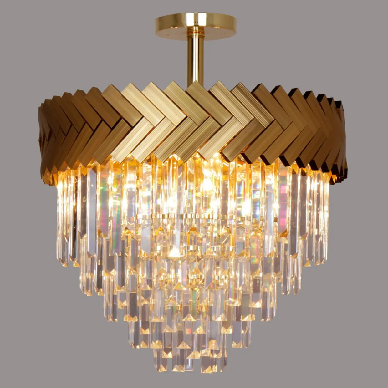 - 5 warstw szklanych ozdób zawieszonych na stelażu w złotym kolorze zostało ułożonych na wzór kaskady – od największego koła do najmniejszego.