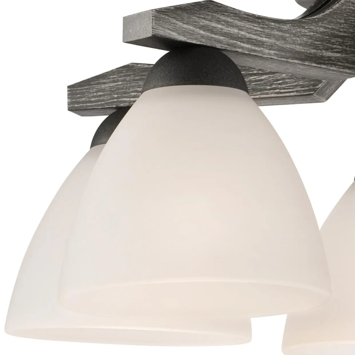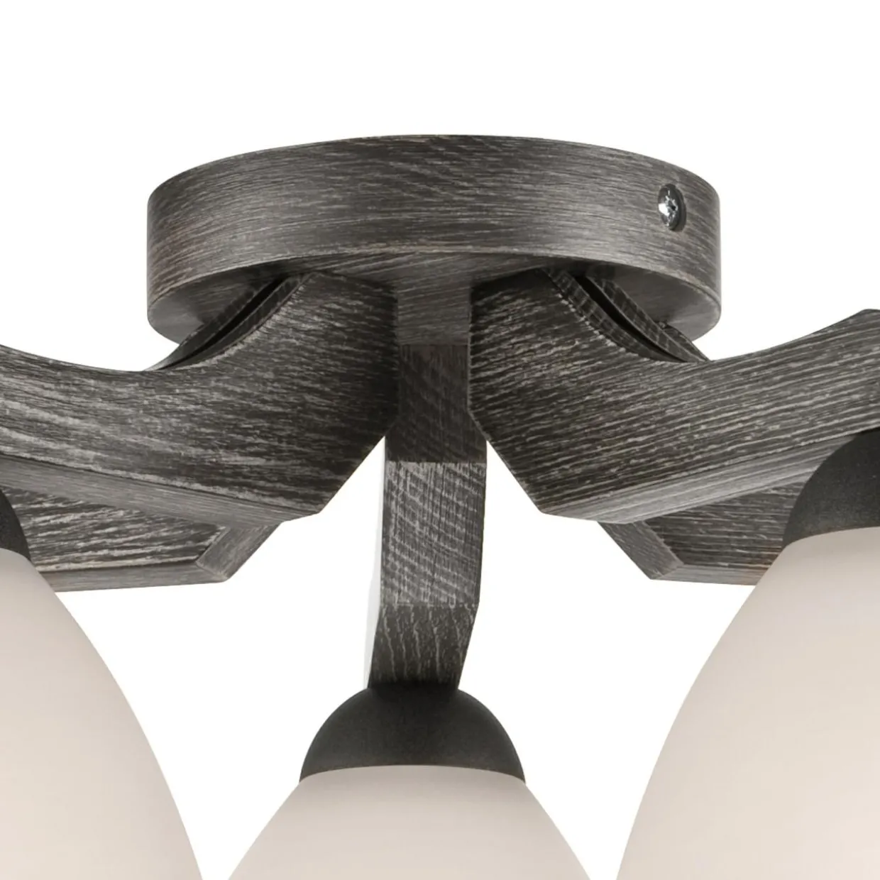 Ozdobna część w kolorze grafitu i wzorze drewna połączona została z matową bielą tradycyjnego klosza.