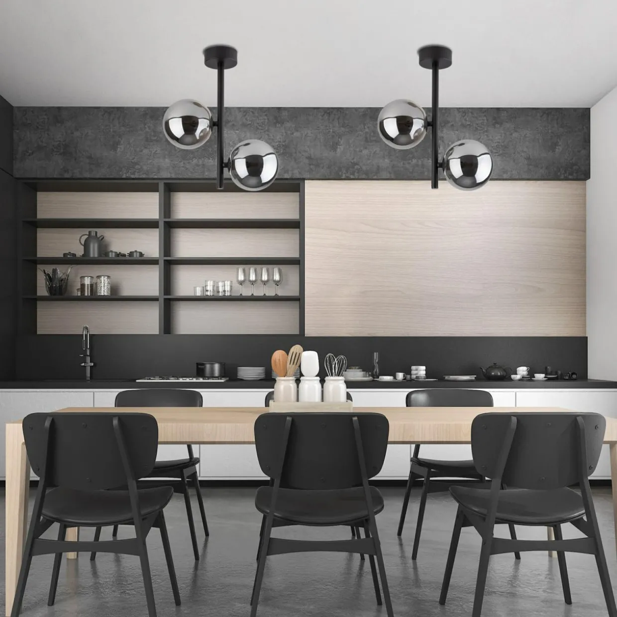 2 żarówki otoczone kulistymi kloszami doskonale oświetlą pomieszczenie, a elegancki czarny kolor wykończenia sprawdzi się we wnętrzach o loftowej lub nowoczesnej aranżacji.