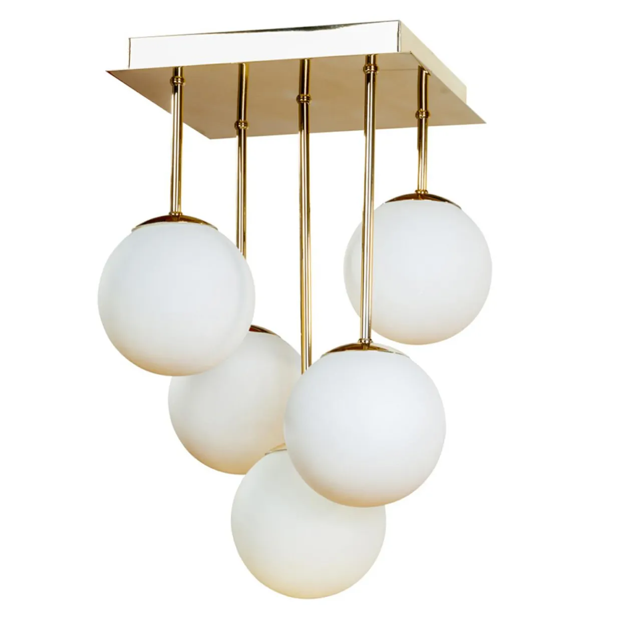 Jej charakterystyczne wykończenie w złotym kolorze i mleczno-białe klosze doskonale korespondują z meblami w odcieniach drewna, brązu, czerni i bieli.