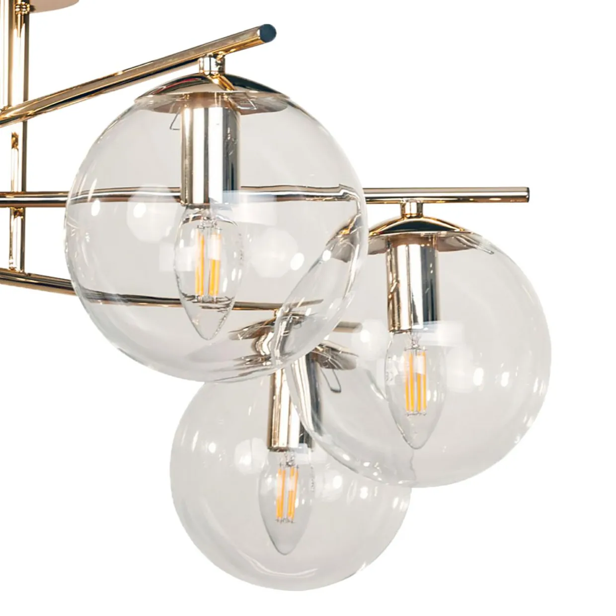 Kuliste, transparentne klosze lampy sufitowej ZOE połączone oprawą w kolorze złota dodadzą do nowoczesnej przestrzeni odrobinę elegancji i estetyki glamour.