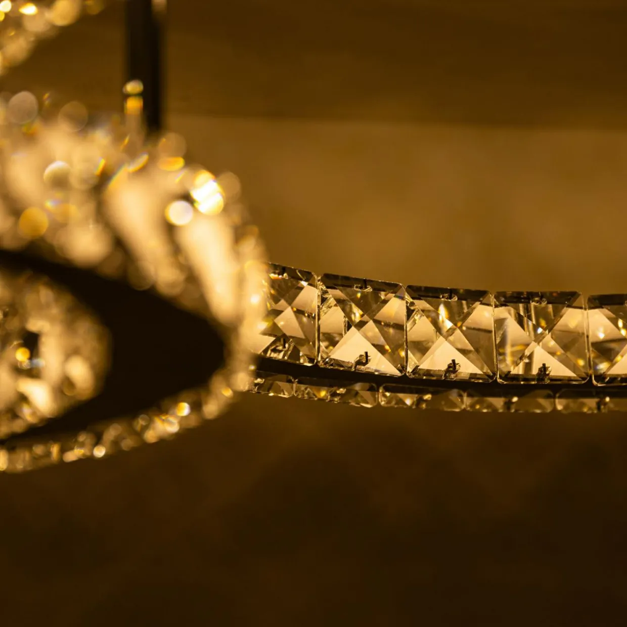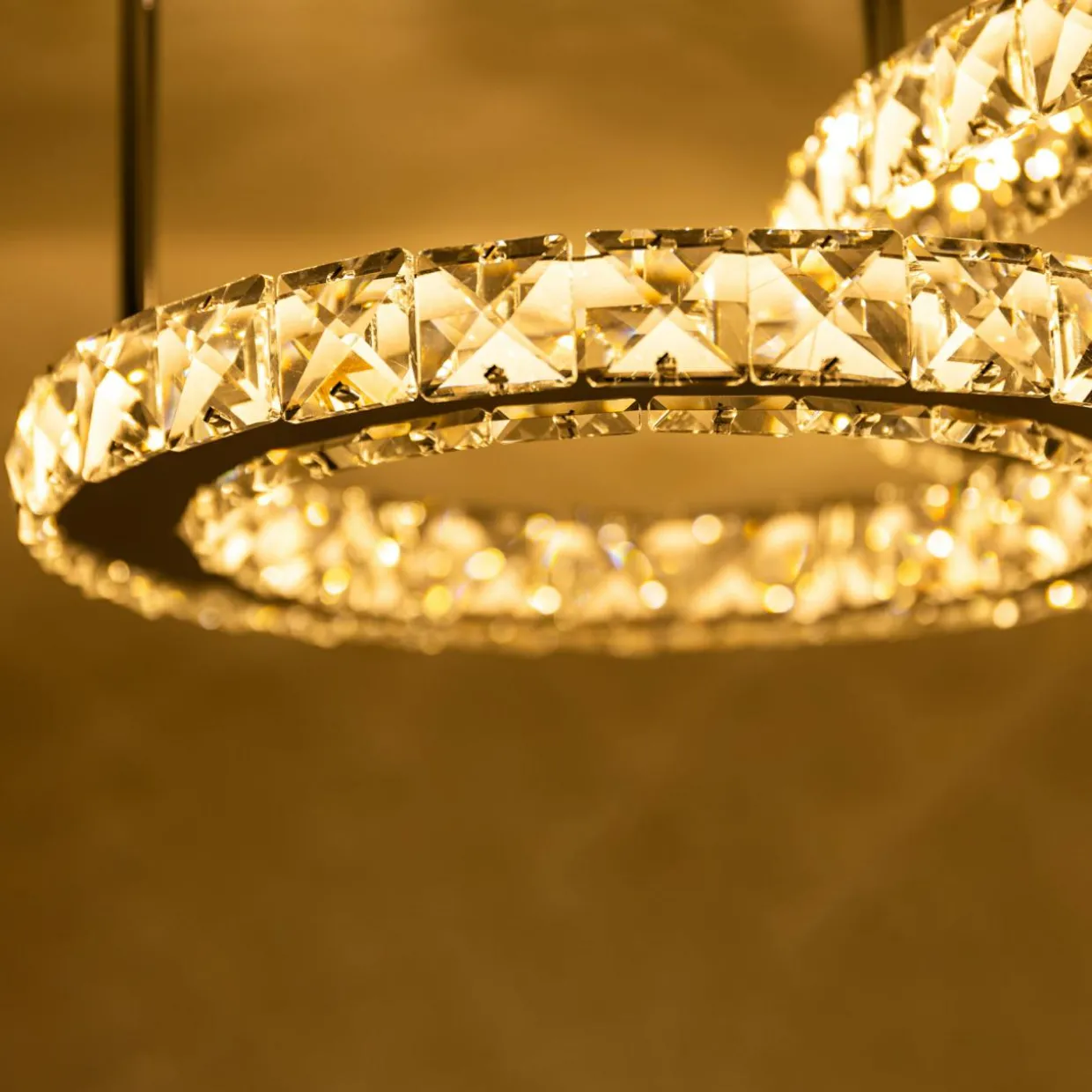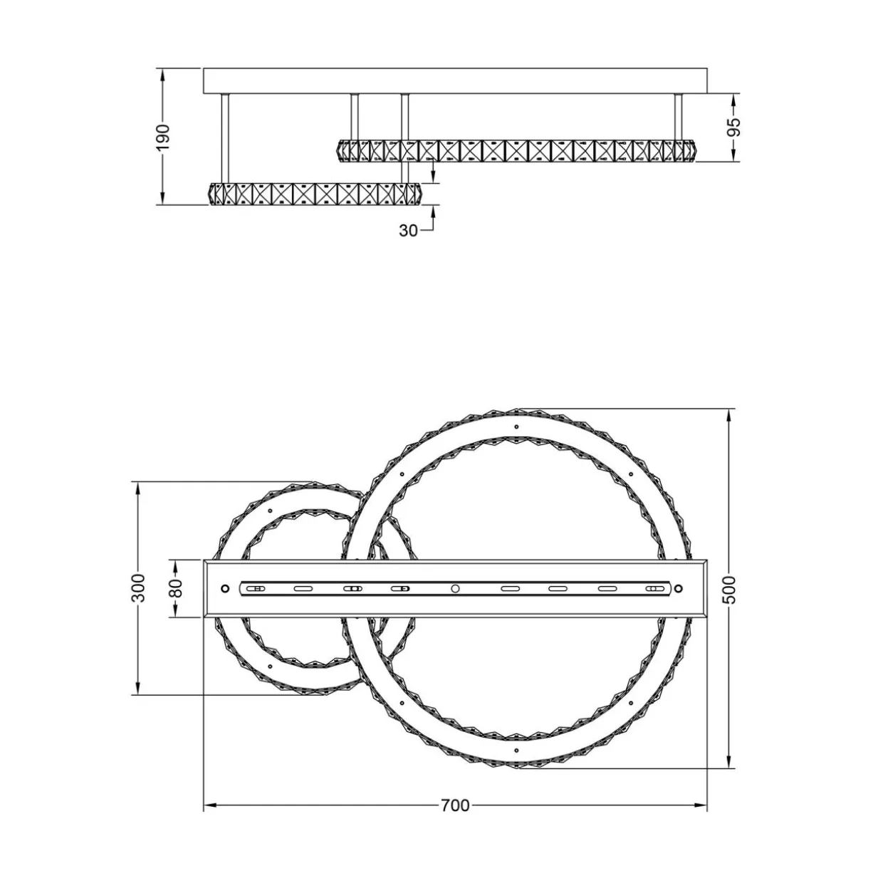 - Zwraca uwagę fantazyjnym, przyjemnym dla oka kształtem, który bazuje na 2 okręgach z wbudowanym oświetleniem typu LED oraz stylizowanymi na kryształowe ozdobami w centrum misternie wykonanej konstrukcji.