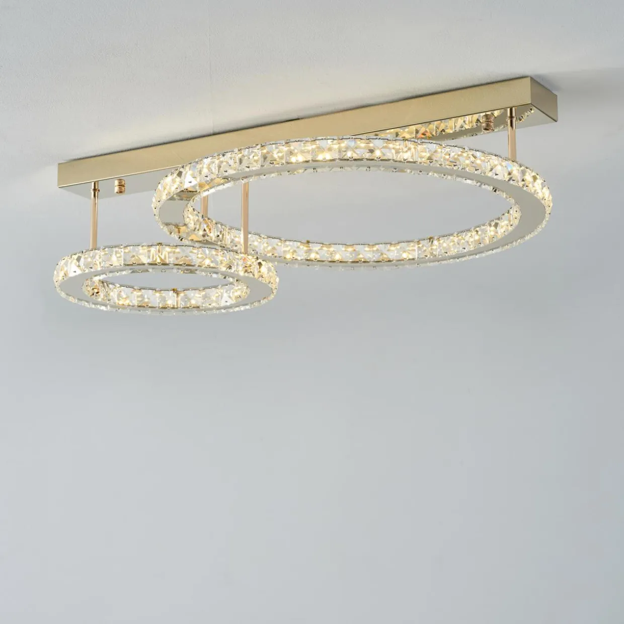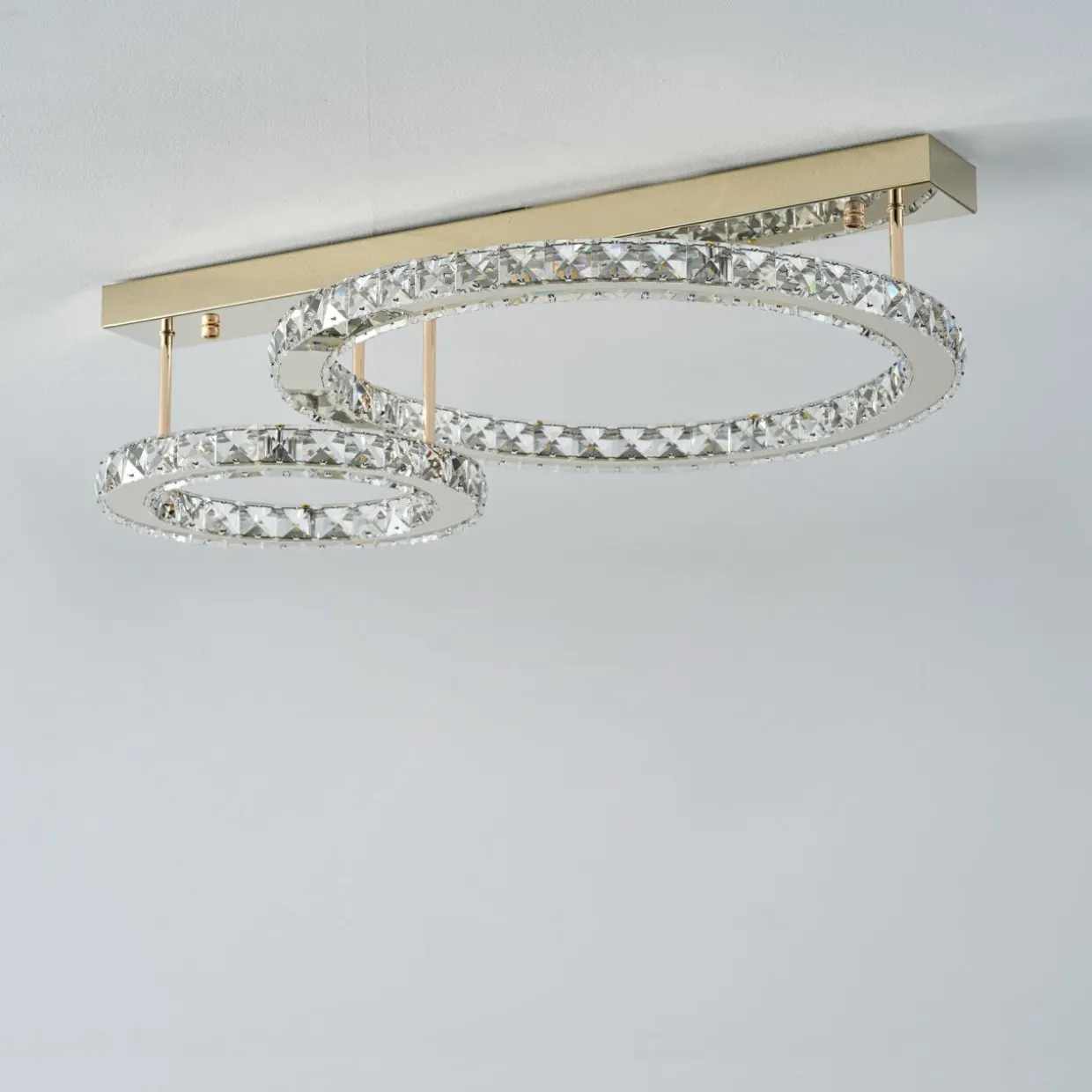 - Zwraca uwagę fantazyjnym, przyjemnym dla oka kształtem, który bazuje na 2 okręgach z wbudowanym oświetleniem typu LED oraz stylizowanymi na kryształowe ozdobami w centrum misternie wykonanej konstrukcji.