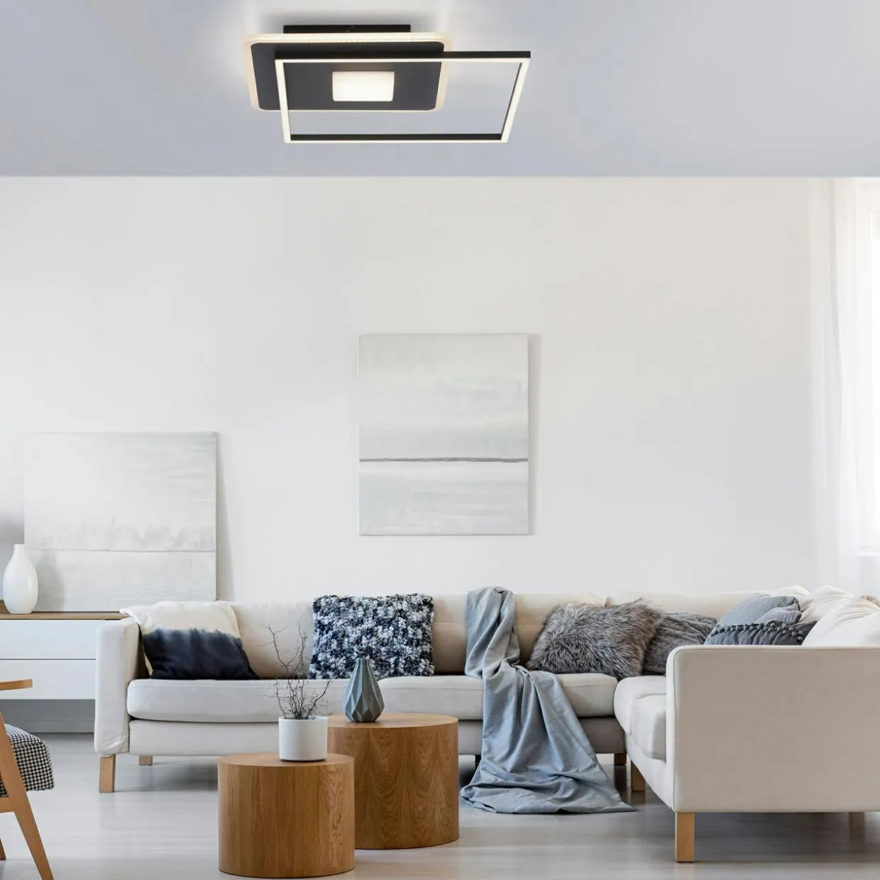 Urządź salon w nowoczesnym stylu – wybierz lampę sufitową DOMINO o okrągłej lub kwadratowej oprawie.