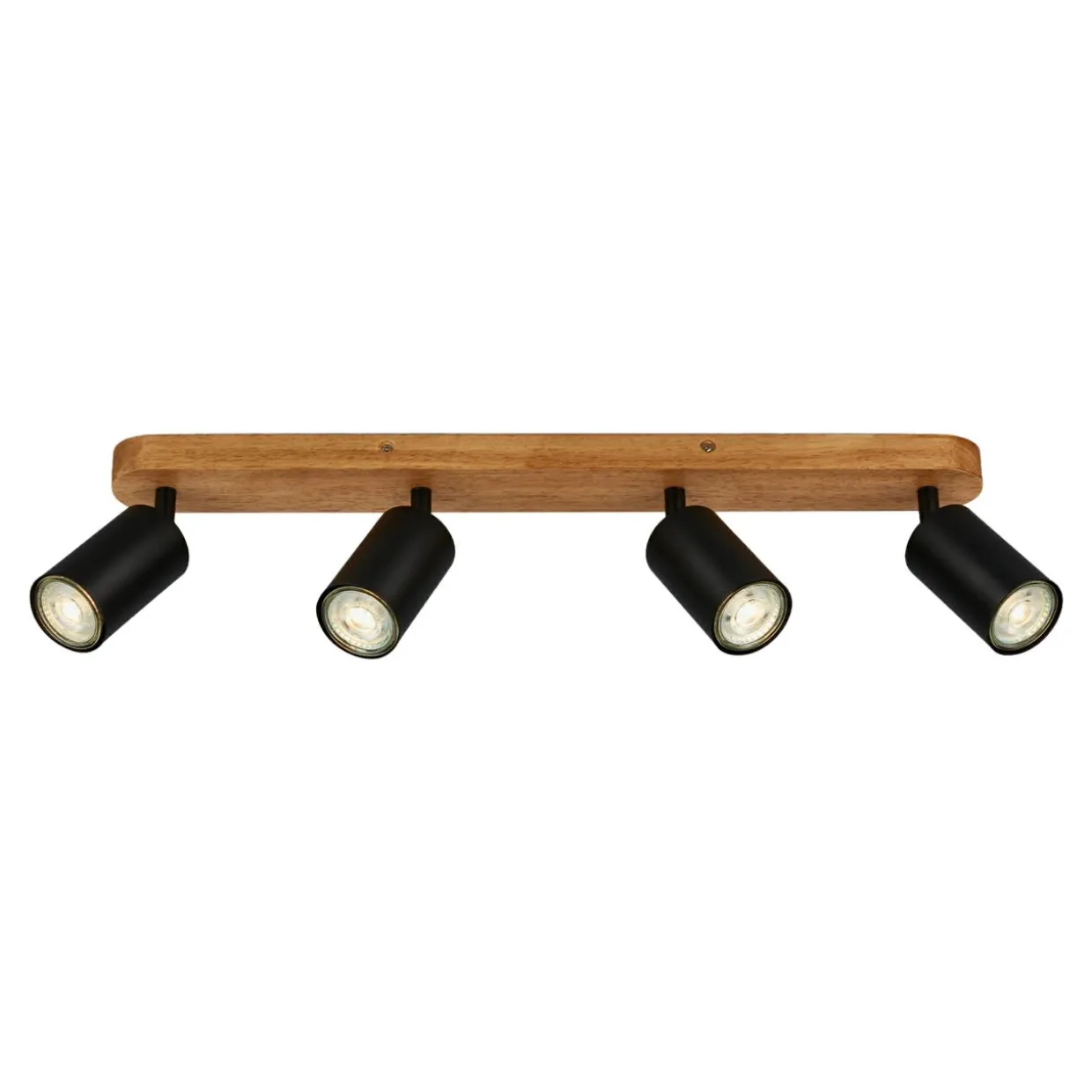 Podstawę stanowi listwa w kolorze jasnego drewna, lekko kontrastująca z 4 czarnymi kloszami o kształcie walców.