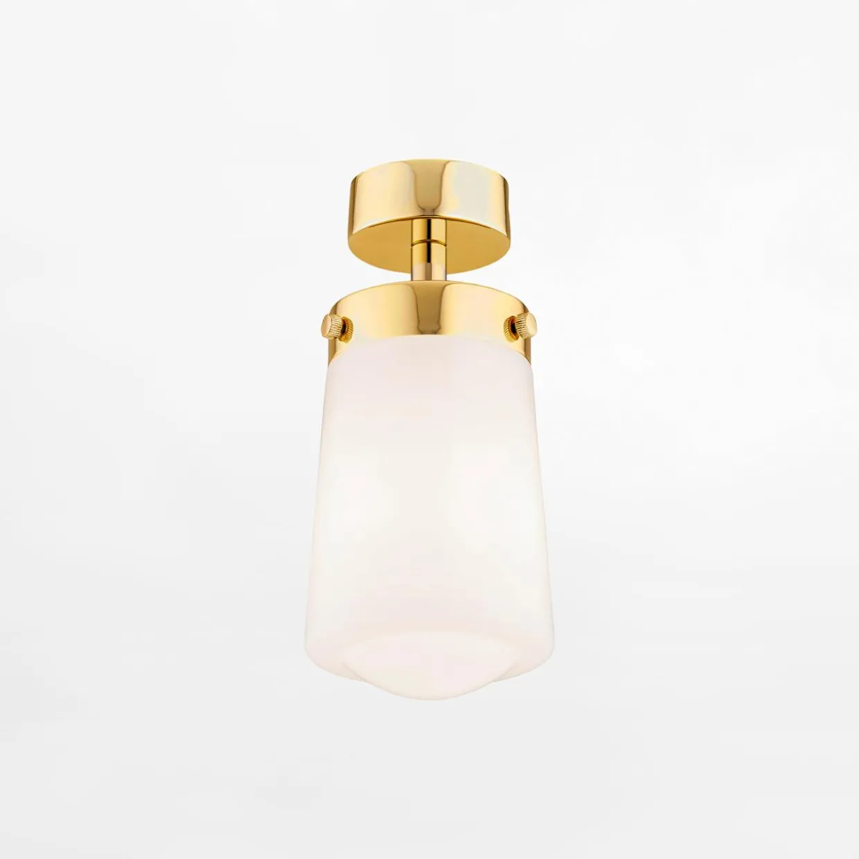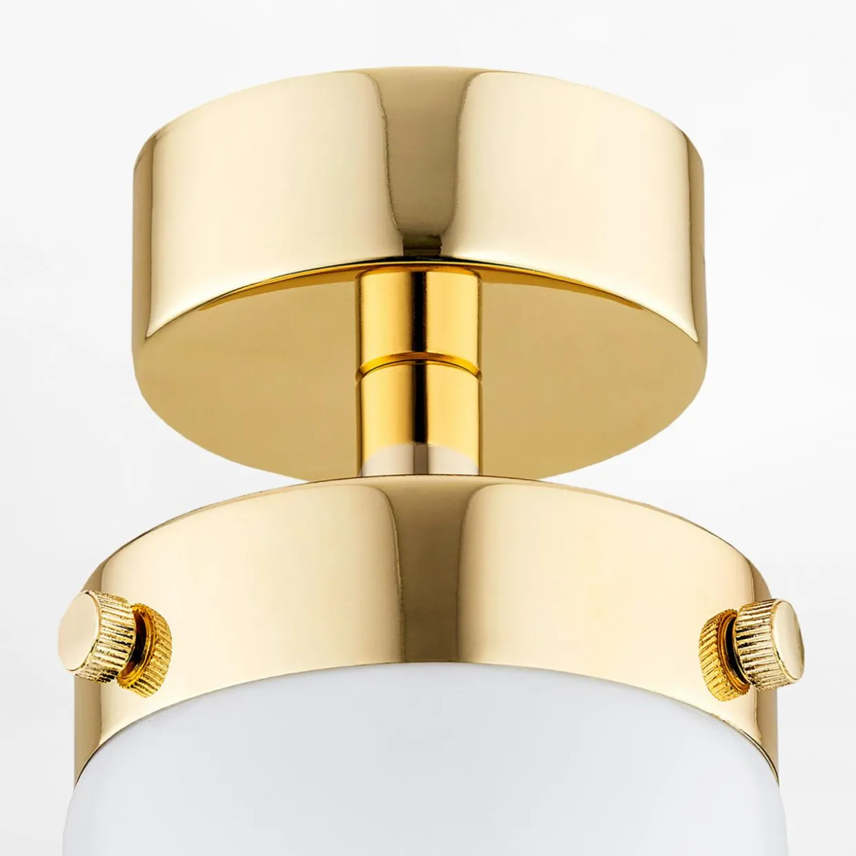 Posiada błyszczące wykończenie w kolorze mosiądzu oraz biały klosz z miejscem na żarówkę typu E27.