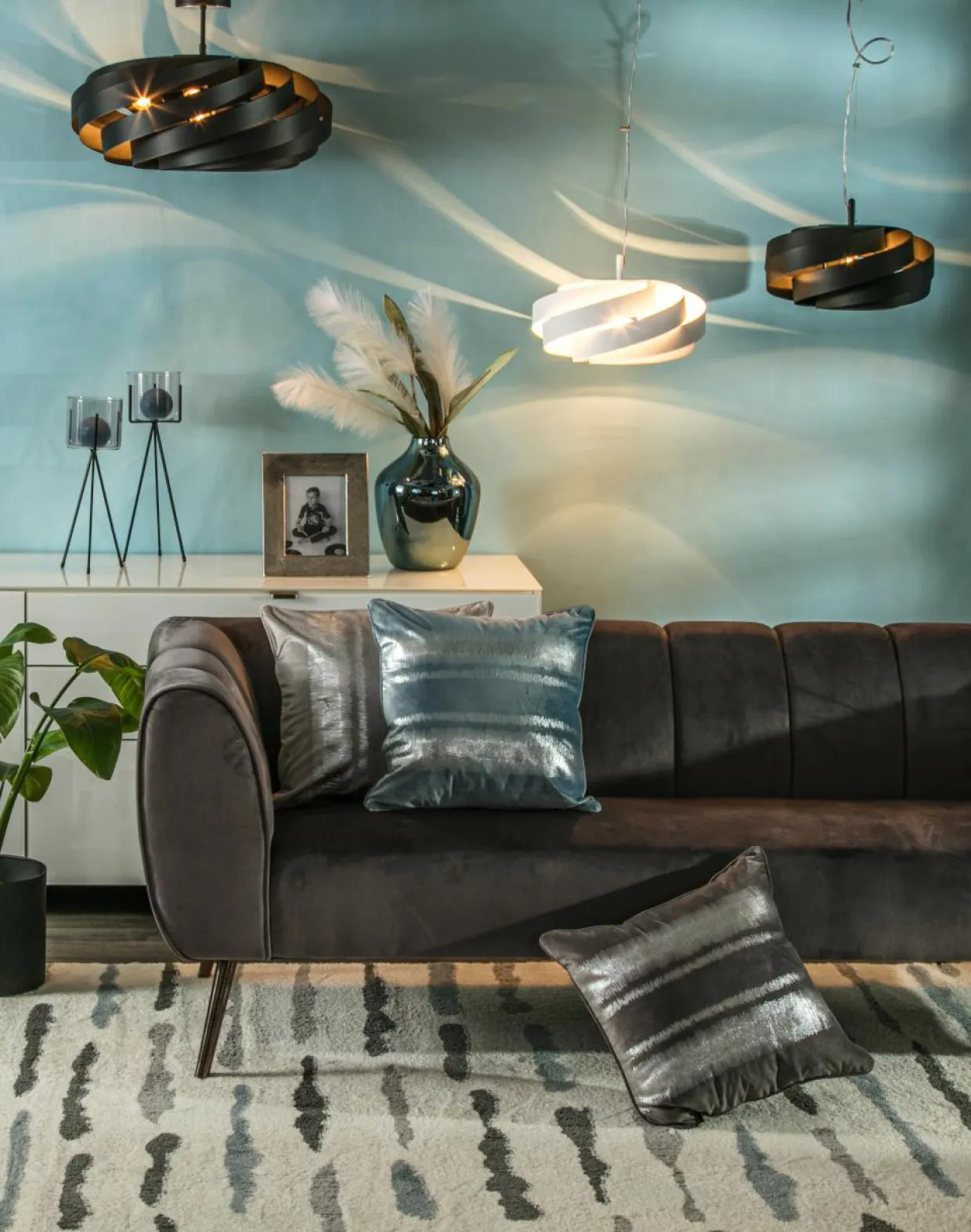 VENTO w całości wykonana z metalu zachwyca czarnym wykończenem (jedynie część podsufitki i klosza mają kolor chromu). Kolorystyka lampy pięknie współgra w zestawieniu z prostymi, gustownymi meblami.