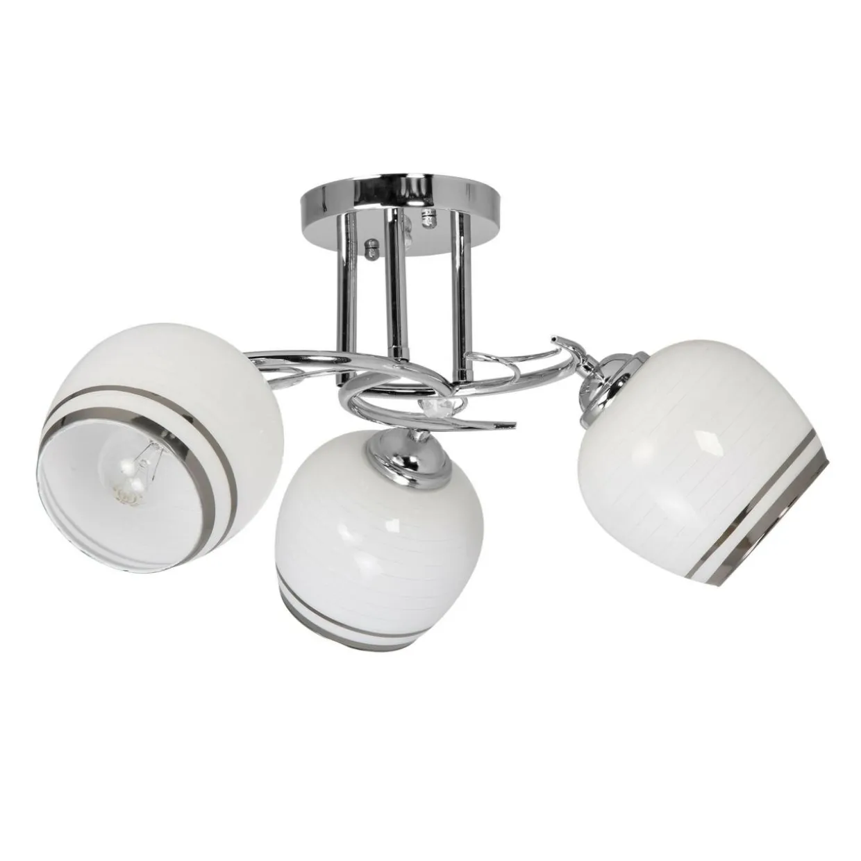 Mlecznobiałe, kuliste klosze ozdobione zostały skromnym dekorem. Ustawione pod lekkim skosem równomiernie oświetlają pomieszczenie oraz świetnie korespondują z metalową oprawą lampy. Całości dopełniają delikatne dodatki dekoracyjne. Wykończenie oraz kolorystyka kloszy sprawiają, że ten model lampy najpełniej prezentuje swe walory pośród jasnej kolorystyki ścian i mebli.