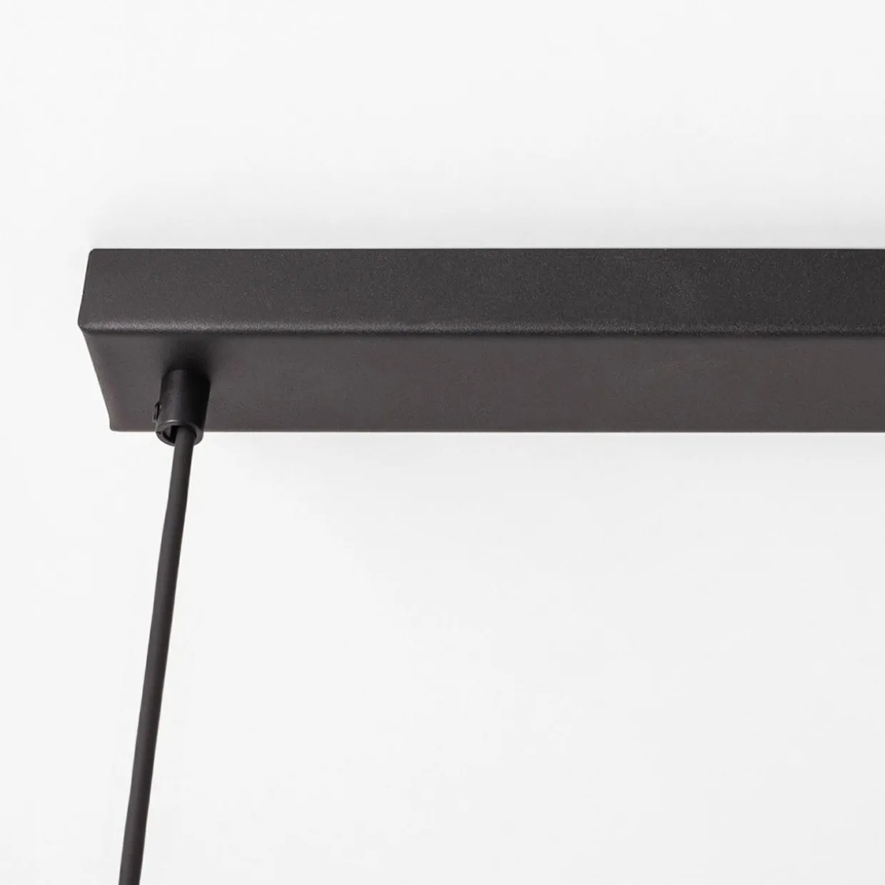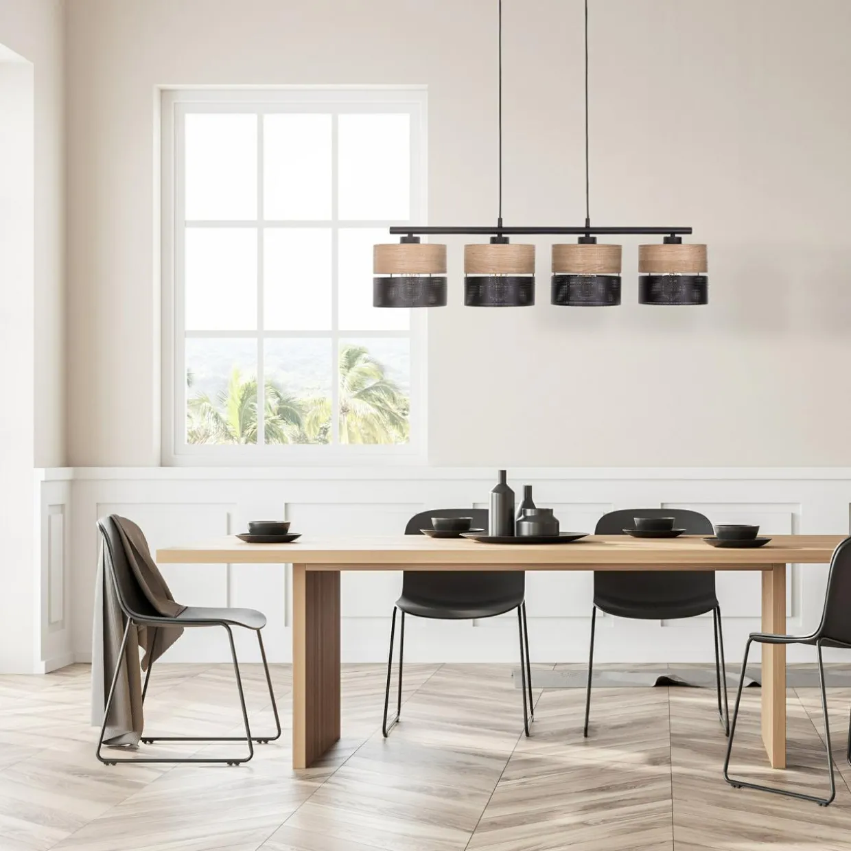 Poczwórny model lampy został zawieszony na listwie, do której przymocowane są 4 zawieszone szeregowo abażury.