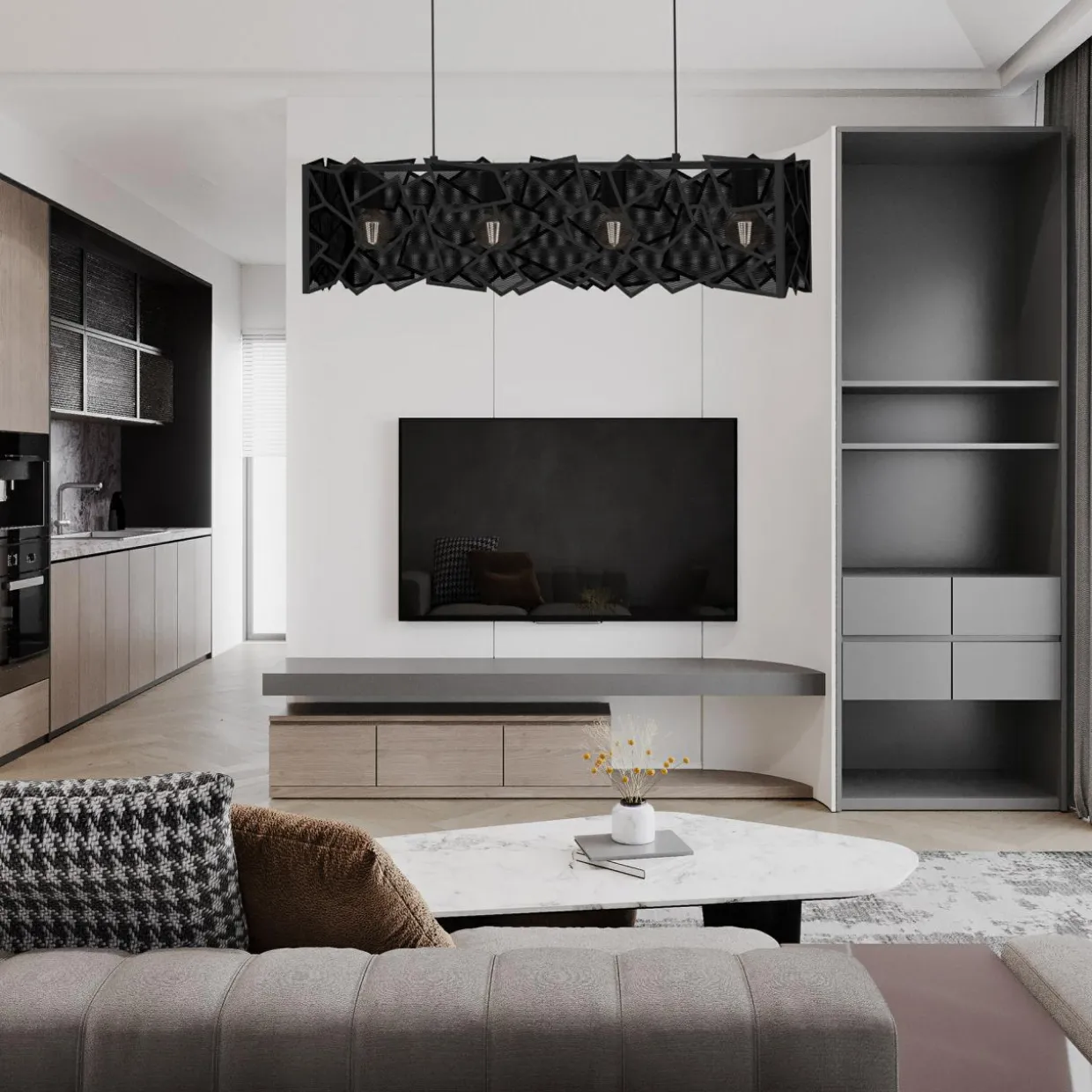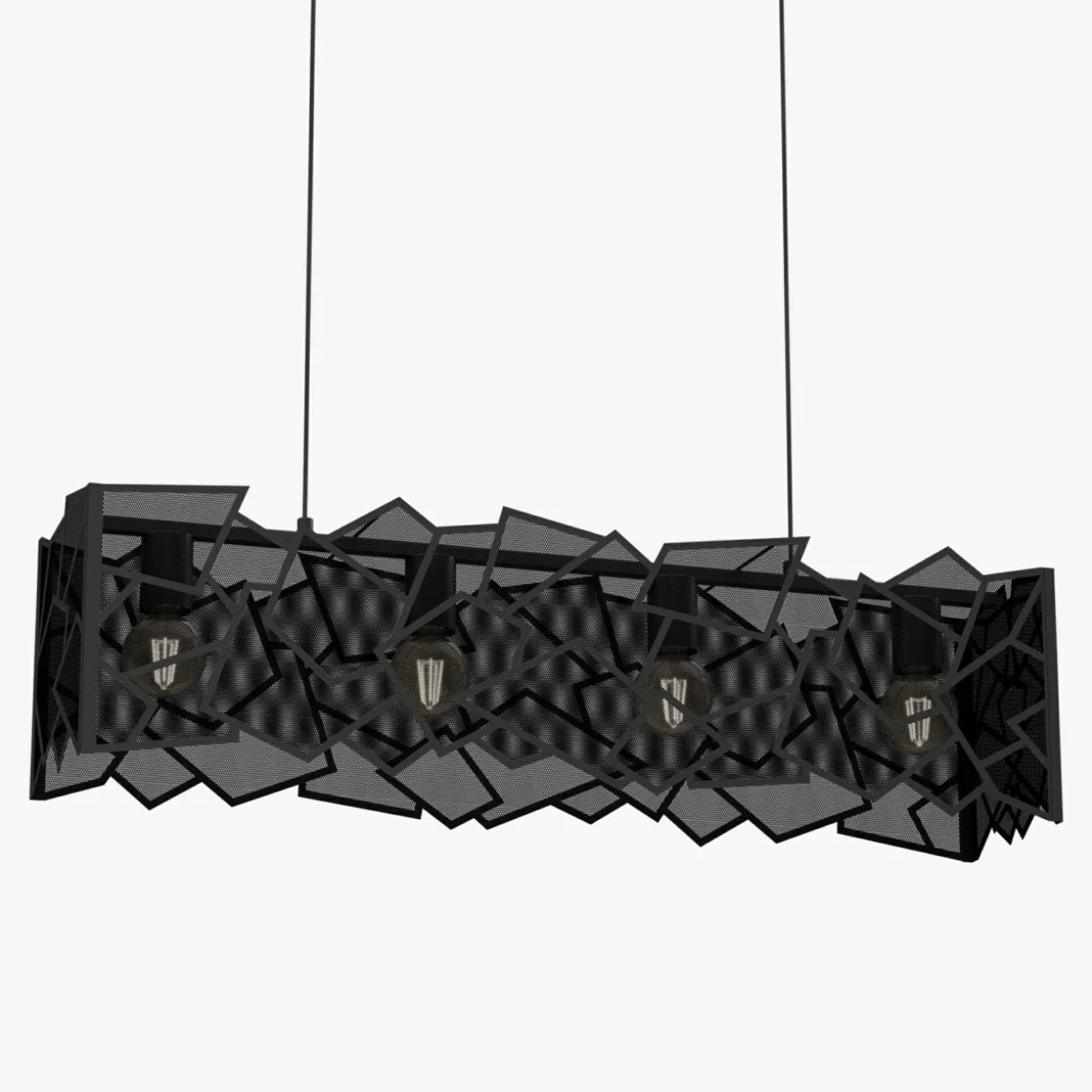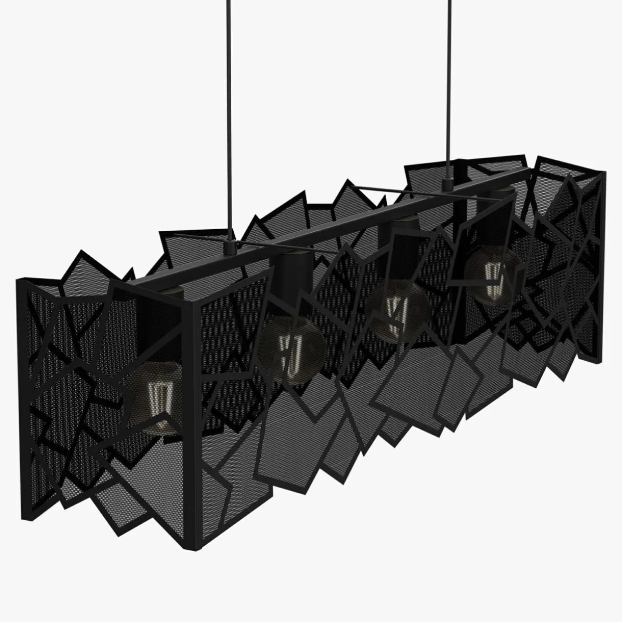 - Metalowy abażur wiszącej lampy CAMO zwraca uwagę ciekawym wzorem – siateczka w czarnym kolorze wpisana w ostro zakończone geometryczne figury. Nachodzące na siebie kształty dyskretnie przysłaniają żarówki.