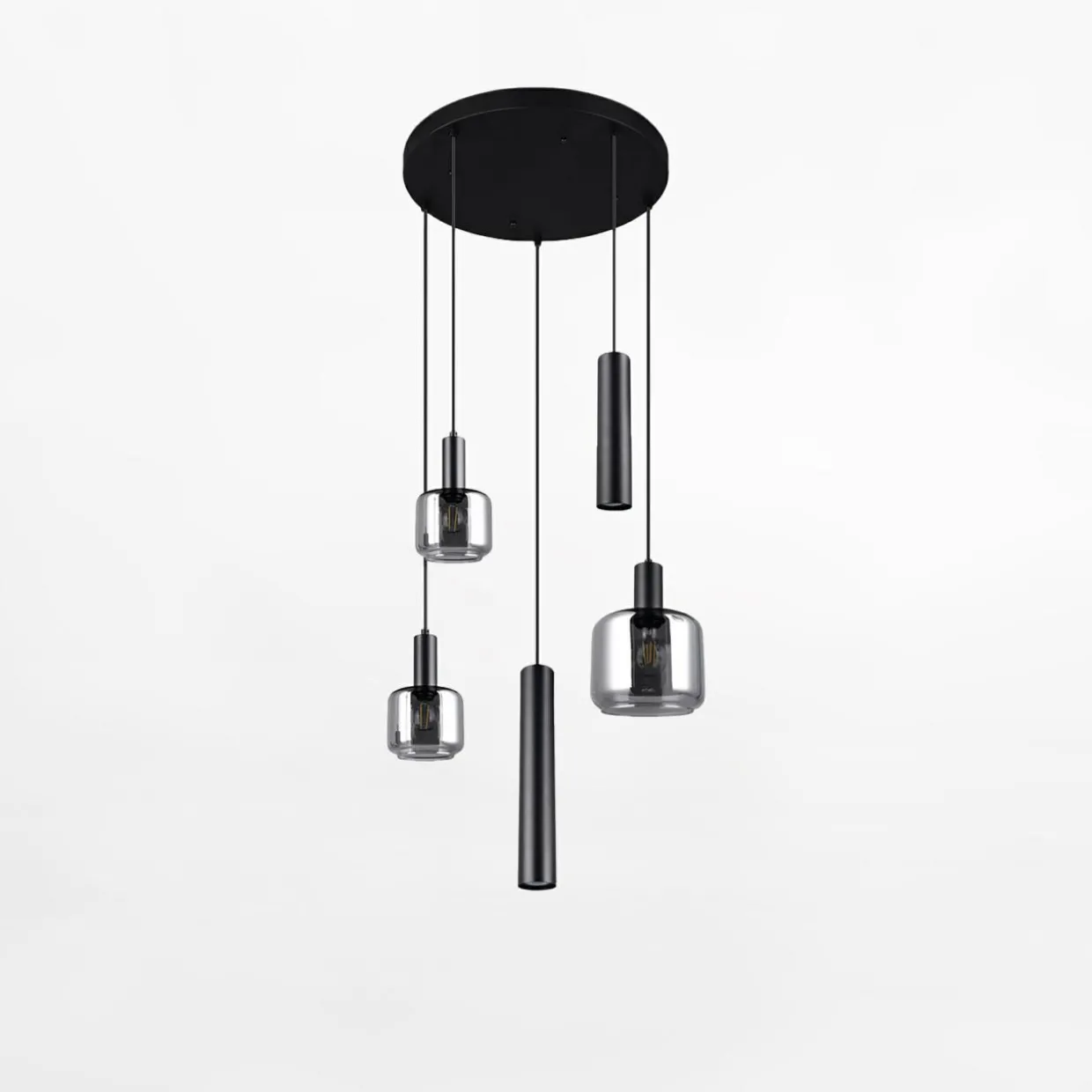 Lampa wisząca MATARO łączy smukłe, metalowe oprawy z szklanymi elementami, tworząc niepowtarzalny efekt światła i odbić.