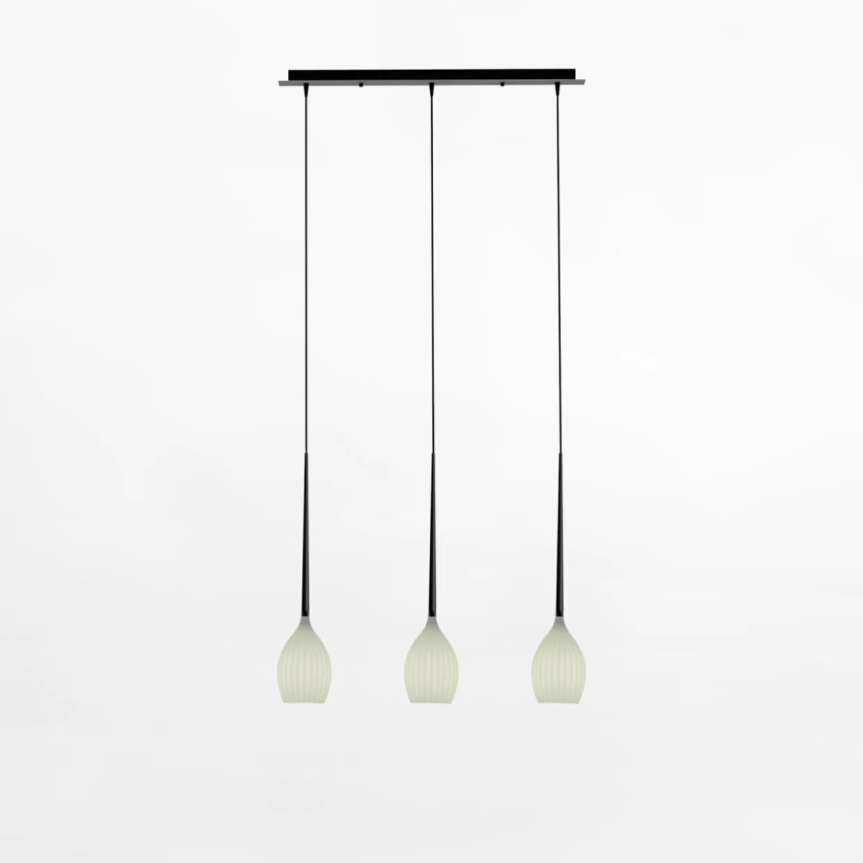 Wiszący model tej lampy zaprojektowany z myślą o wnętrzu jadalni oraz salonu posiada oprawę dla 3 żarówek, koncentrycznie rozmieszczonych wzdłuż wąskiej podstawy o kształcie listwy.