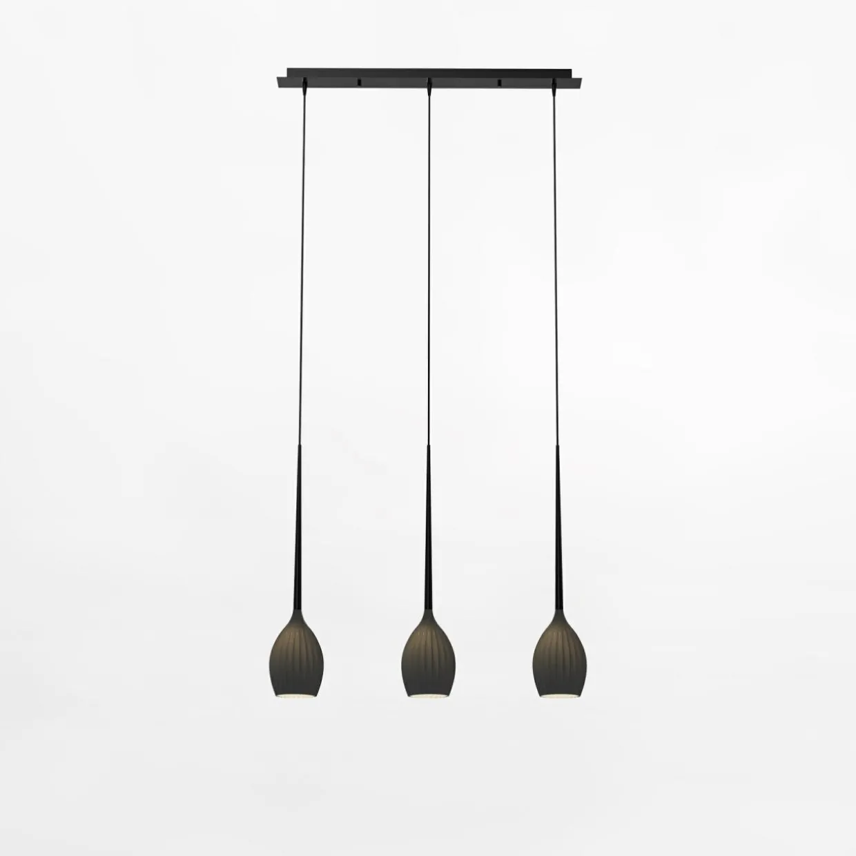 Wiszący model tej lampy zaprojektowany z myślą o wnętrzu jadalni oraz salonu. Posiada oprawę dla 3 żarówek rozmieszczonych wzdłuż wąskiej podstawy o kształcie listwy.