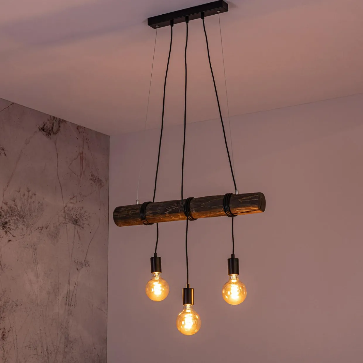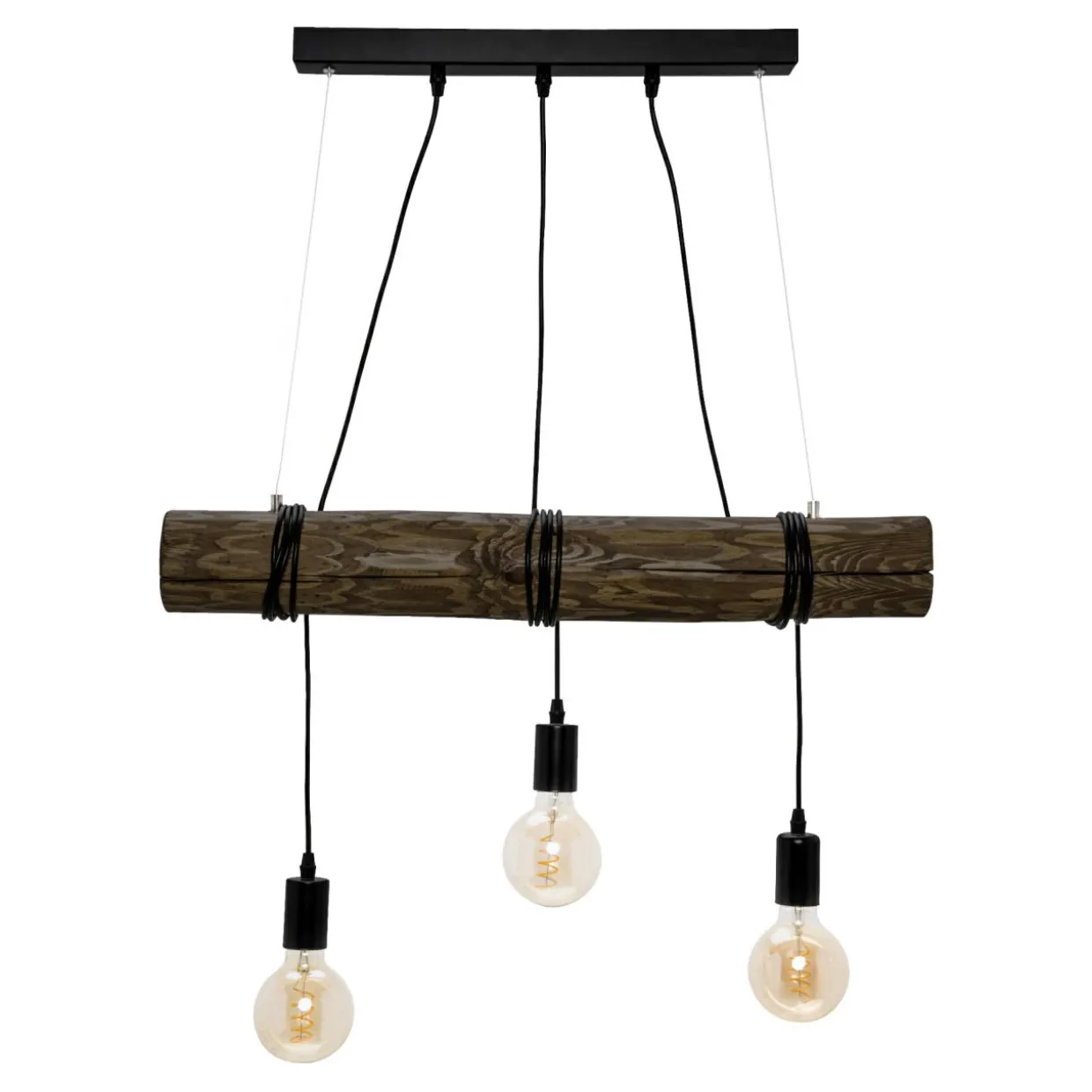 Długość lampy można dostosować w zależności od wysokości sufitu. Możemy też regulować zawieszenie żarówek poprzez nawinięcie przewodu na drewnianą listwę.