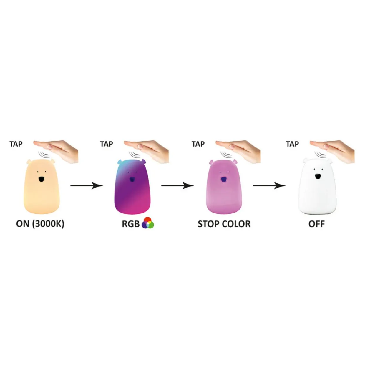 Zastanawiasz się jak włączyć lampkę? Nic prostszego. Kiedy lekko uderzy się misia od góry zaczyna płynnie zmieniać kolory. Następnym uderzeniem można kolor zatrzymać.