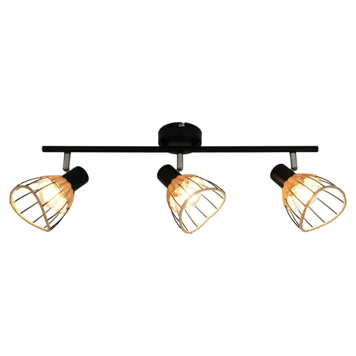 Lampa GENT posiada okrągłą podstawę z listwą, na której znajdują się 3 klosze w kształcie kopuły zaprojektowane z połączonych ze sobą czarnych elementów. Wykończenie w postaci rattanowej plecionki znajduje się w górnej każdego z nich oraz tuż przy brzegach.