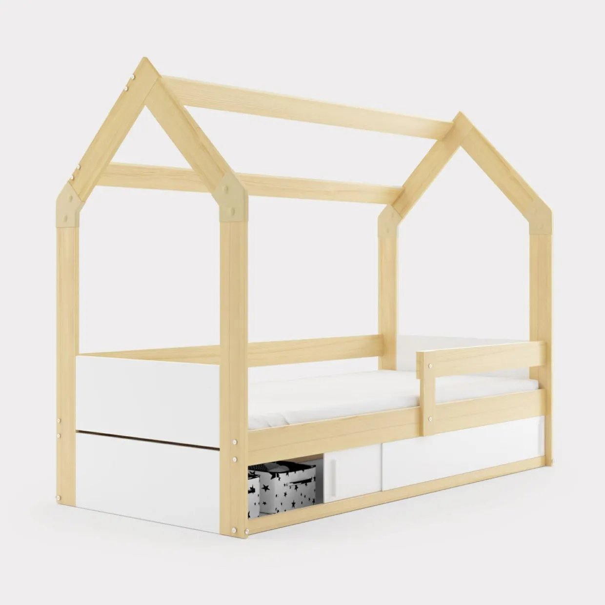 Łóżko HAVEN posiada ramę w kształcie domku – wspólnie z maluchem możecie ozdobić ją kolorowymi lampkami i ręcznie robionymi dekoracjami.