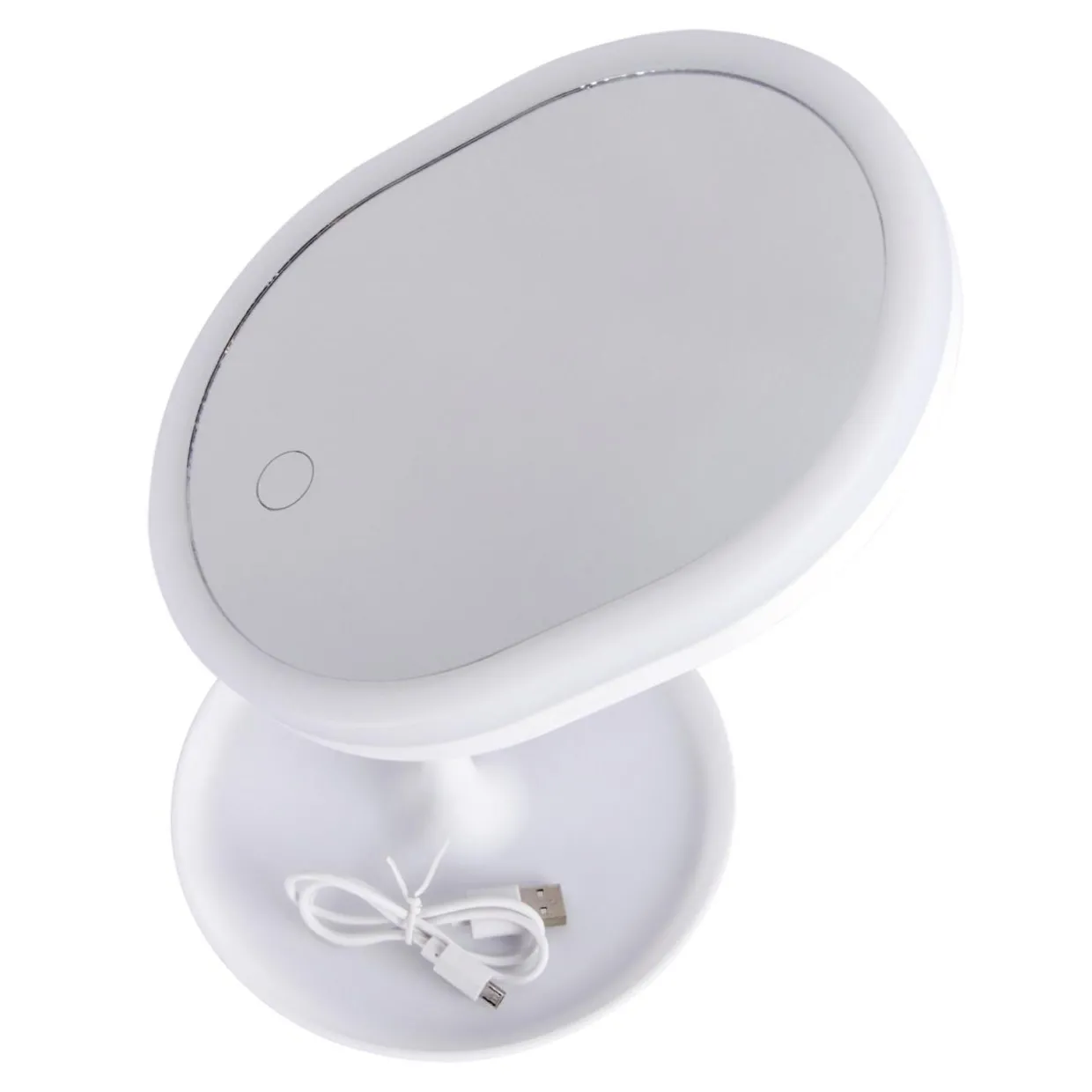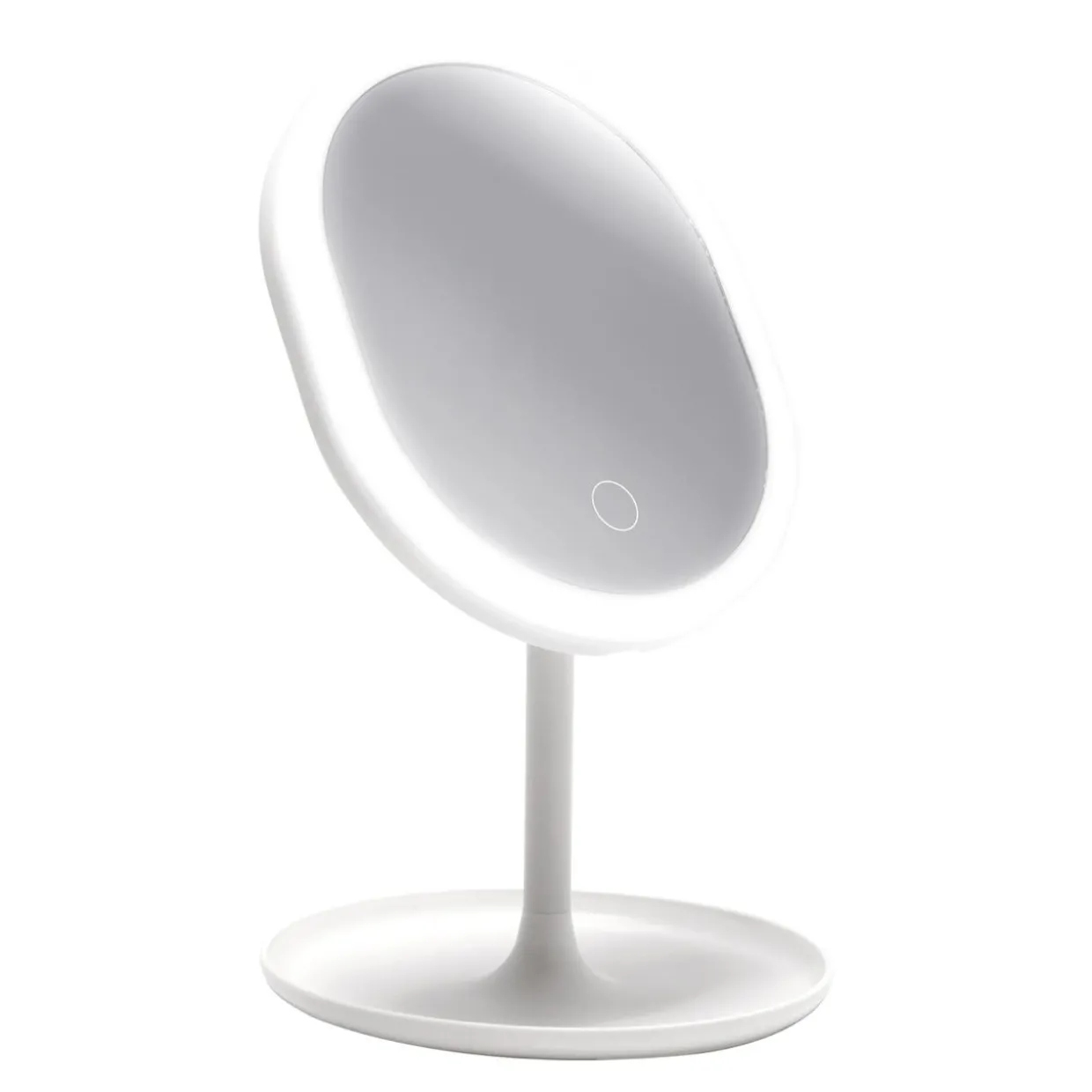 Biała oprawa rozjaśnia się światłem po naciśnięciu przycisku na powierzchni tafli lustra, tym samym doświetlając twarz osoby, która się w nim przegląda.