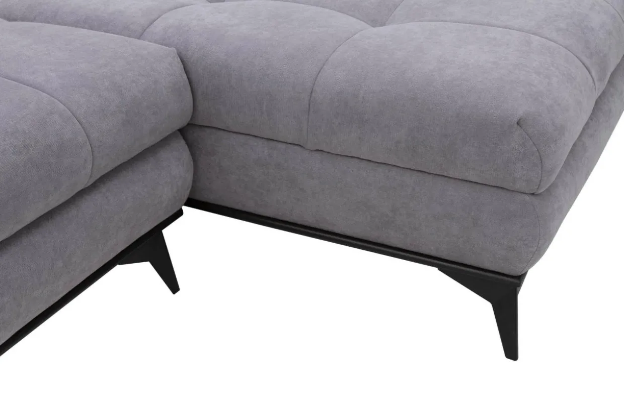 Narożnik pokryty jest miękką i miłą w dotyku welurową tkaniną SORO. Przednie nóżki są metalowe, nóżki pomocnicze pod meblem są wykonane z tworzywa. Elegancji dodaje mu ozdobna drewniana listwa w kolorze wenge, umieszczona wzdłuż spodu siedziska.