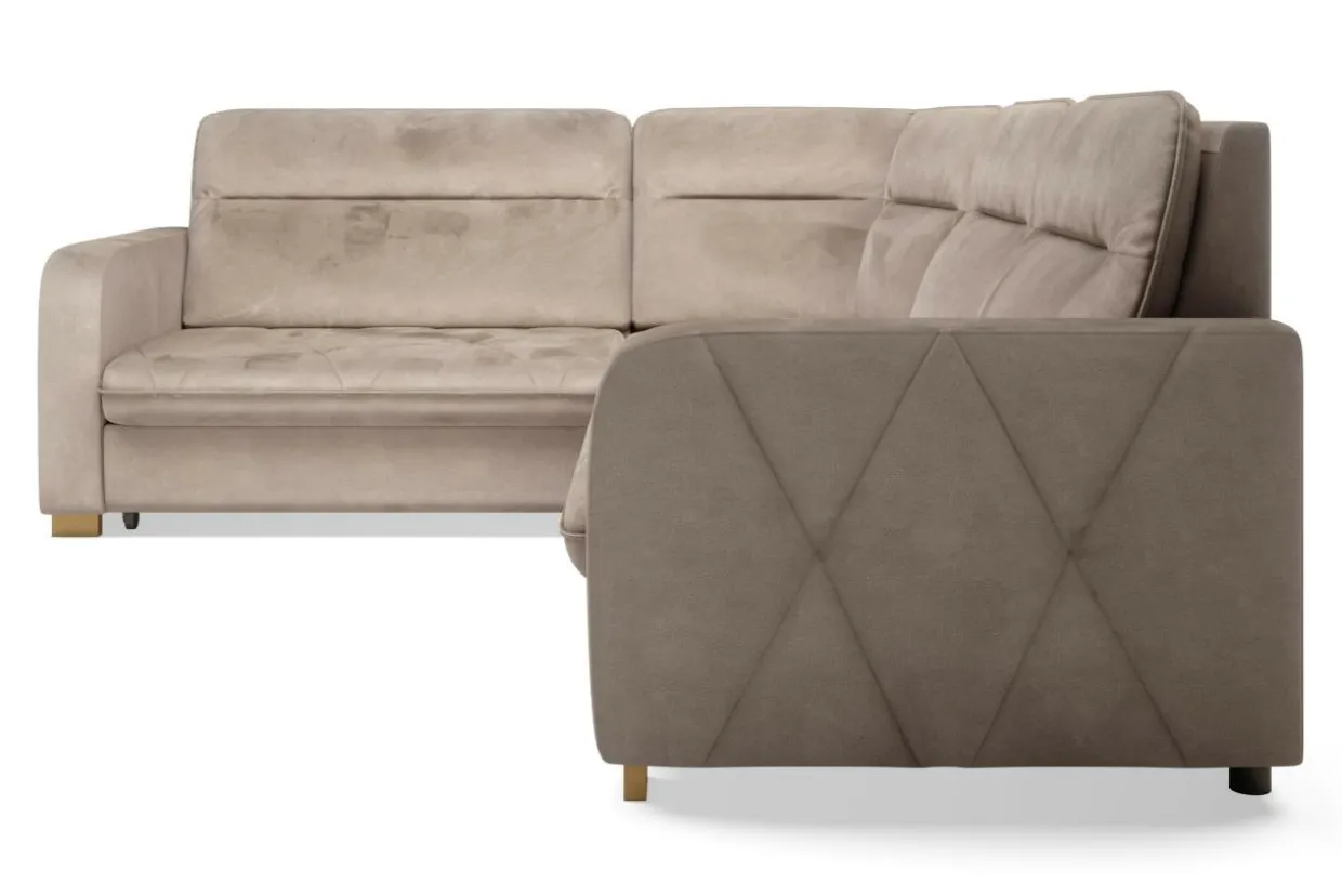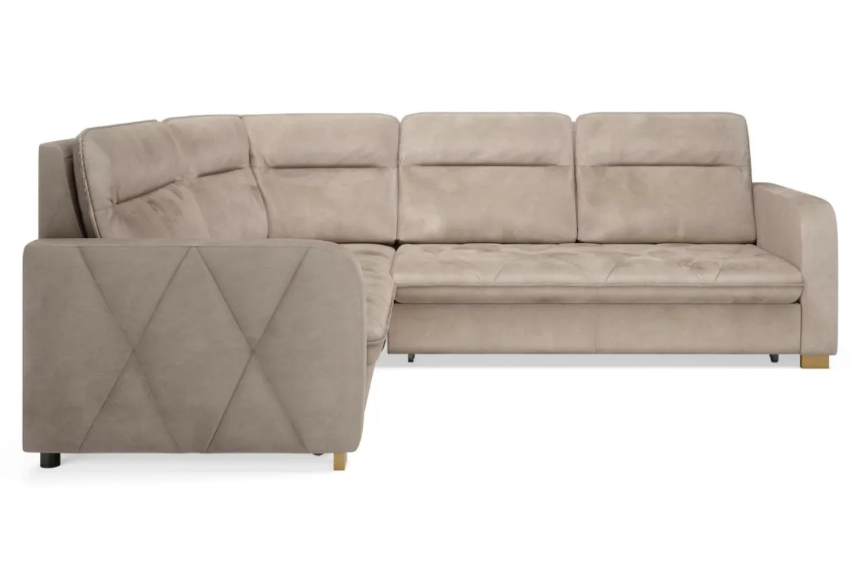 Narożnik SOLAR pokryto welurową tkaniną w beżowym – delikatnym kolorze. Bardzo przyjemnie jest dotykać jej miękkiej powierzchni.