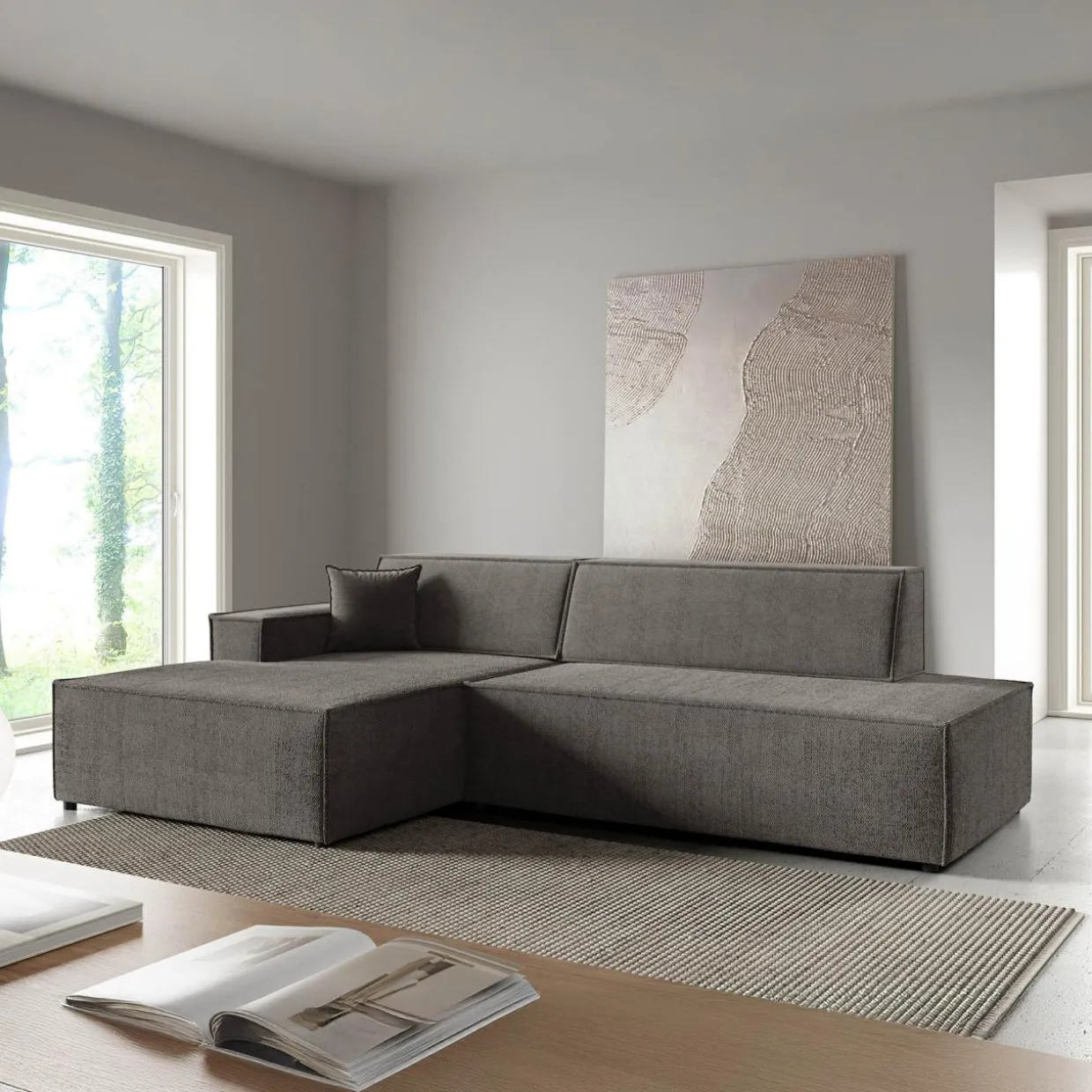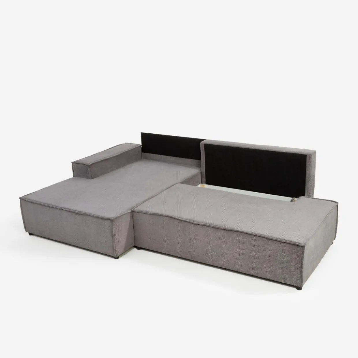 Narożnik w głębokim odcieniu ciemnej szarości doskonale sprawdzi się w nowoczesnych, loftowych lub industrialnych aranżacjach.