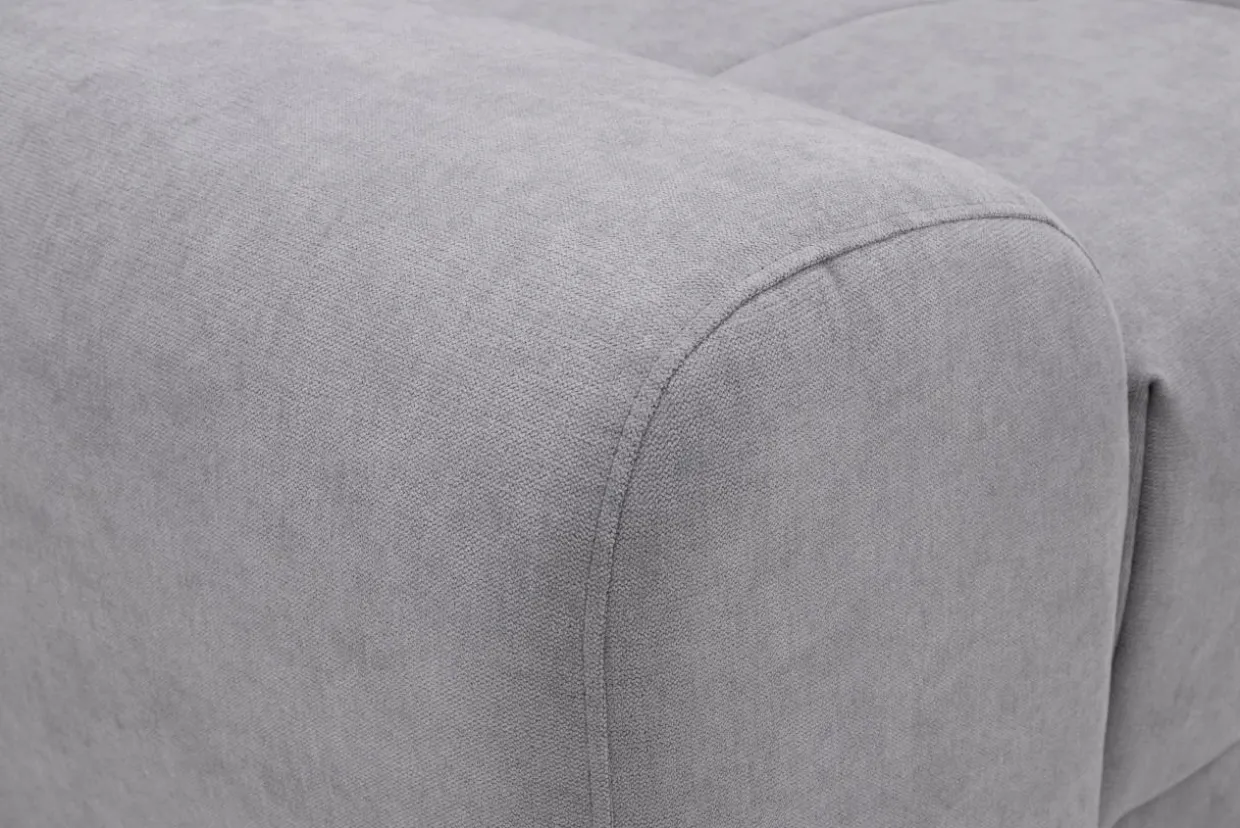 Narożnik został przeszyty w całości szarą tkaniną SORO – materiałem łatwym do utrzymania w czystości, a jednocześnie miękkim i przyjemnym w dotyku.