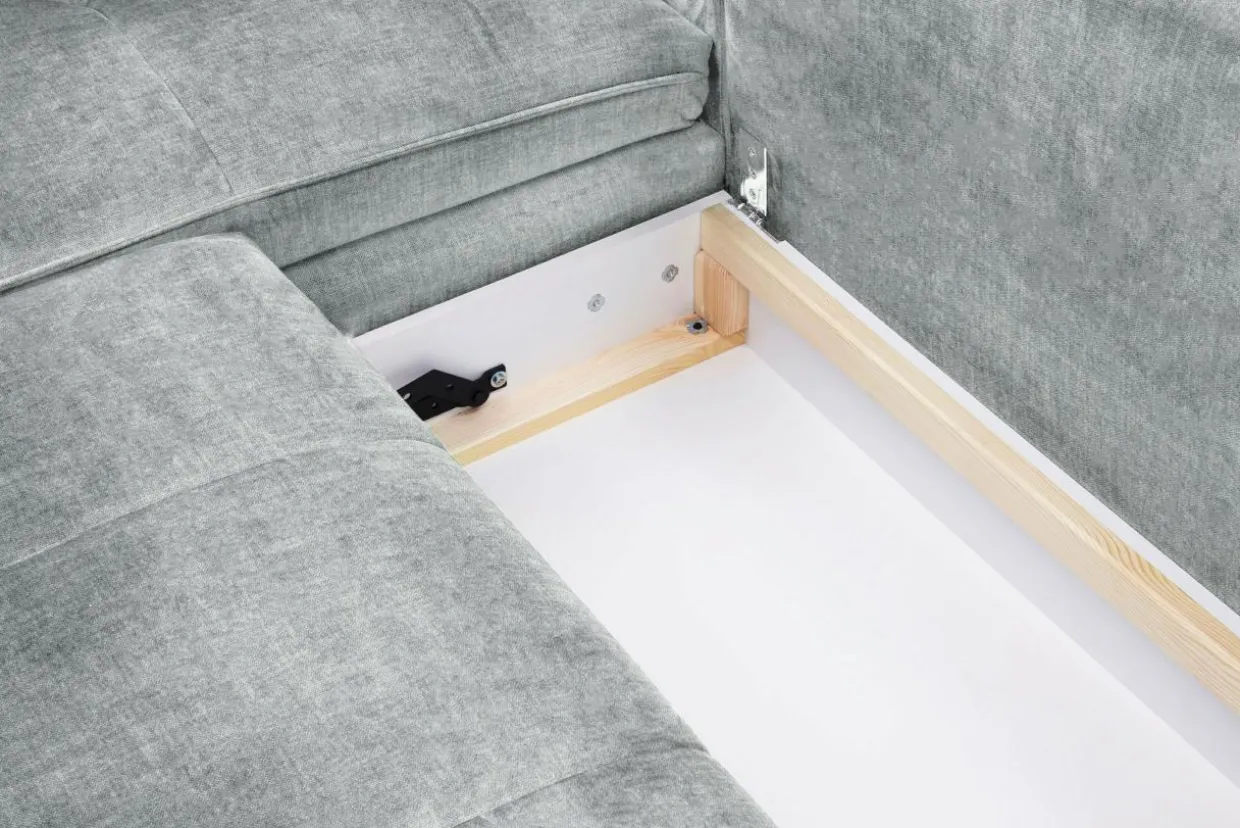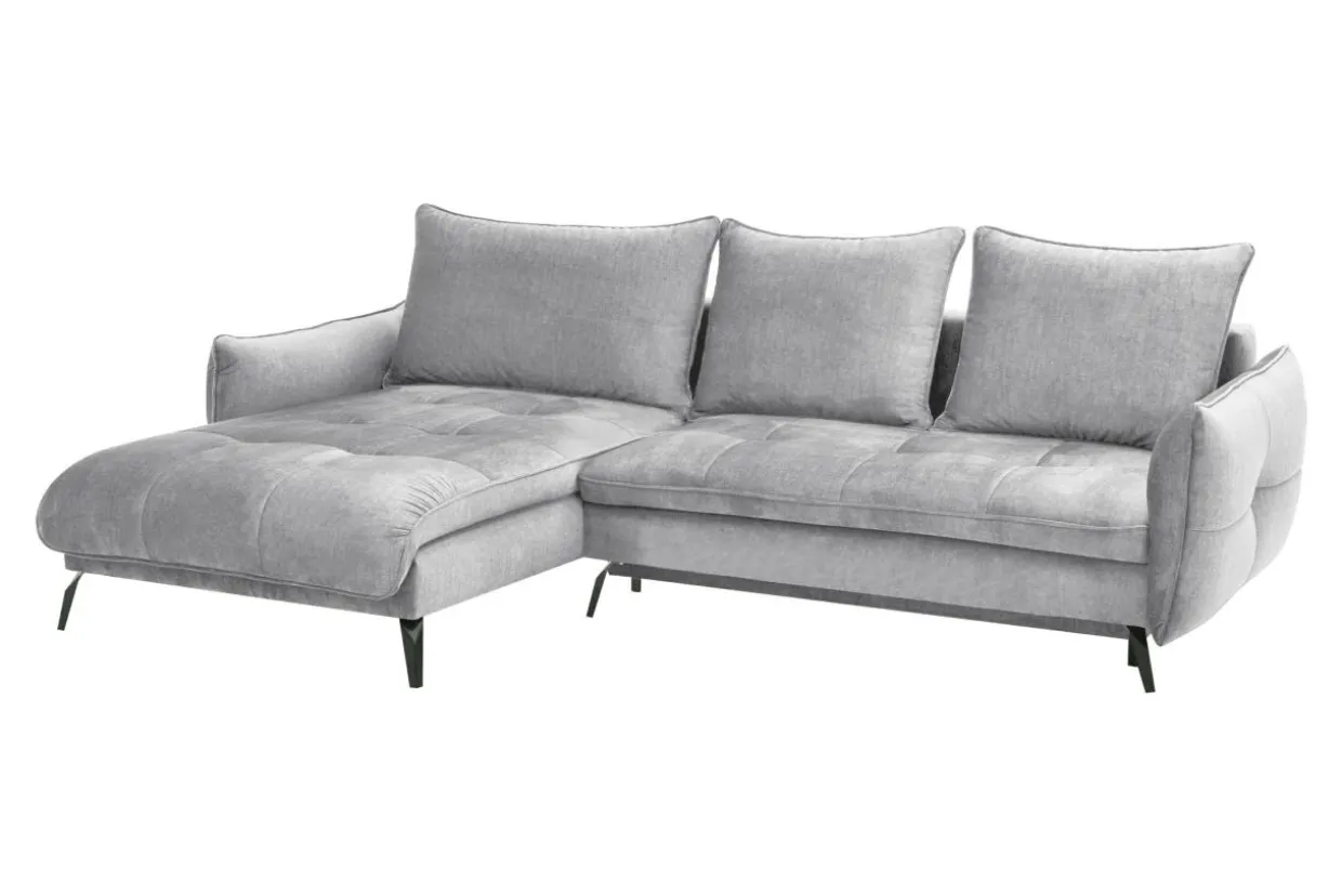 - Narożnik został obity welwetową tkaniną VOGUE w jasnoszarym odcieniu.