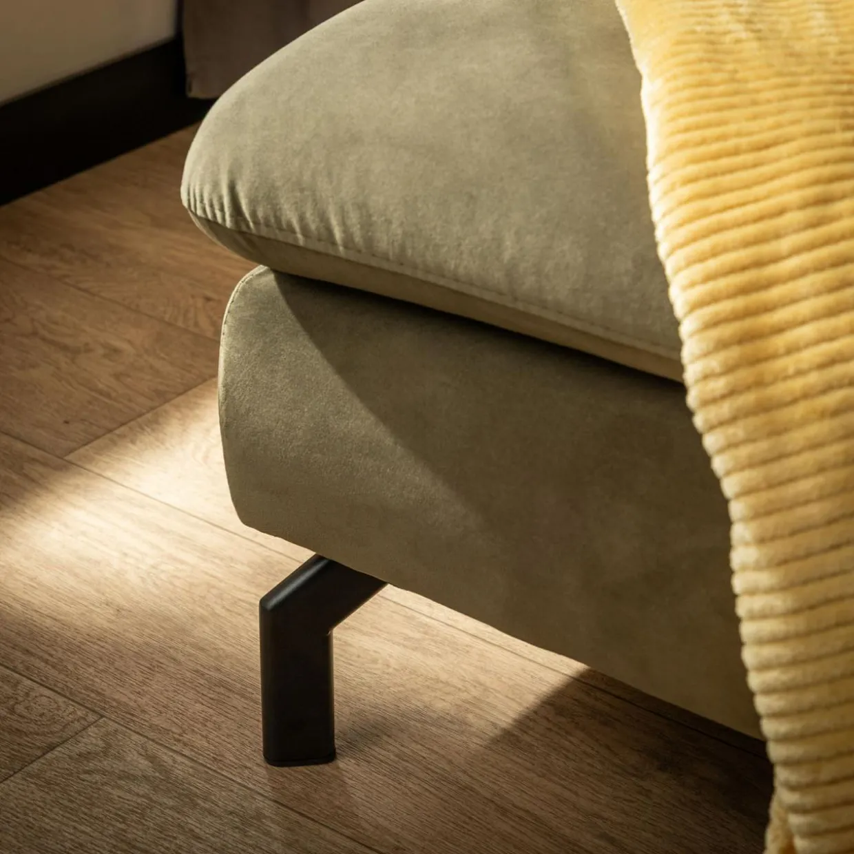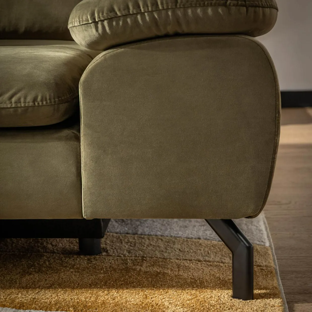Welurowa tkanina w oliwkowym kolorze – miękka struktura, która pod wpływem światła zmienia odcień. Oliwkowy kolor, w którym subtelnie zaznaczają się brązowe i zielone tony, wprowadza do pomieszczenia przyjemną, relaksującą atmosferę.