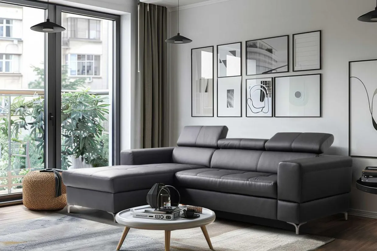 Narożnik posiada wyraziste przeszycia, które dodają mu elegancji.