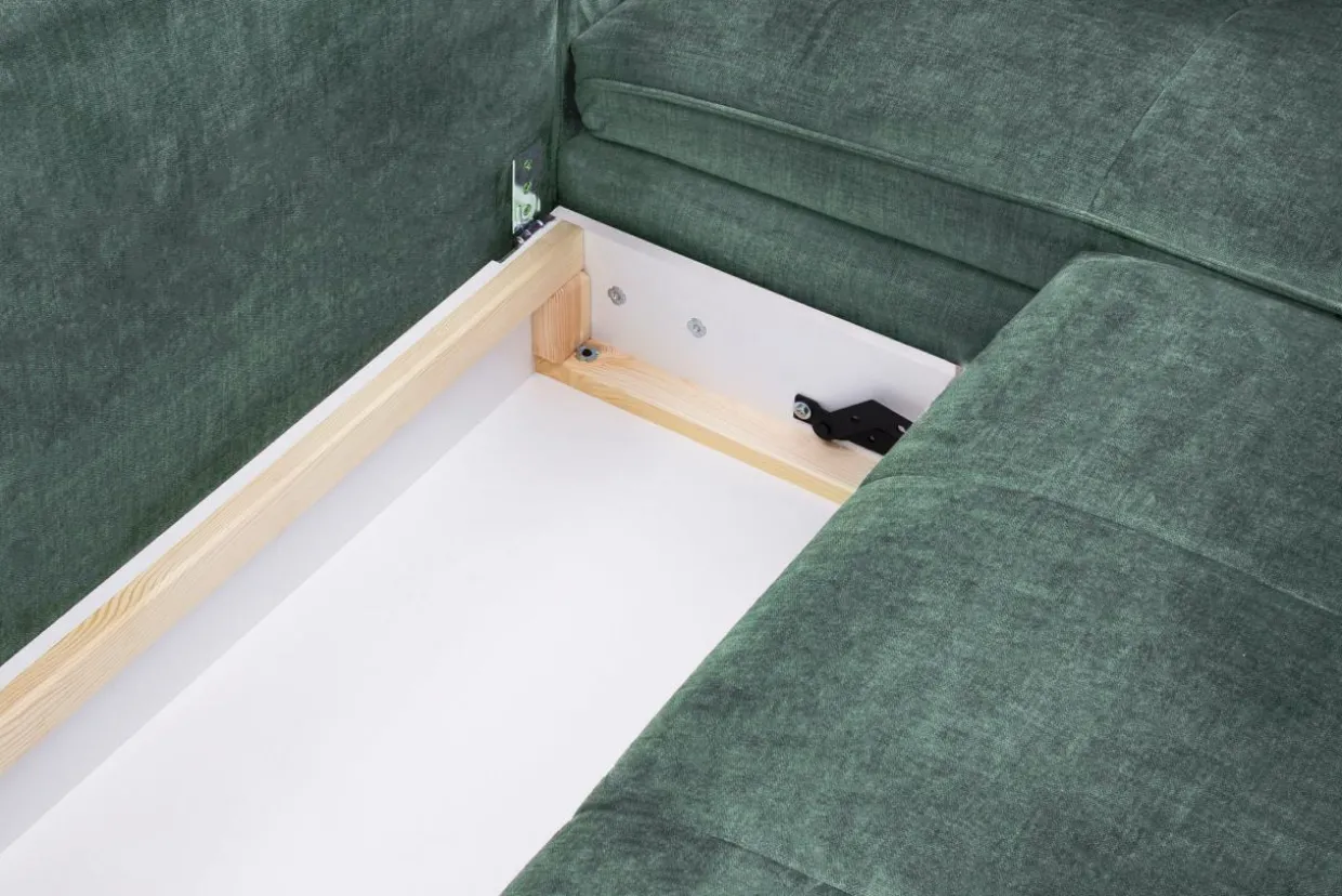 - Narożnik został obity welwetową tkaniną VOGUE w zielonym odcieniu.