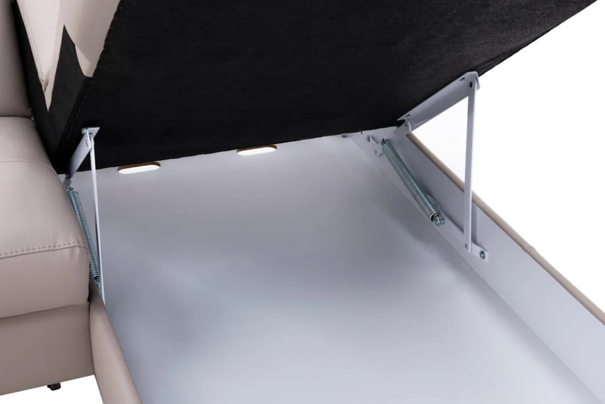 Narożnik posiada wbudowany pojemnik. Możesz wykorzystać go do przechowywania pościeli, koców lub innych tekstyliów. Pojemnik znajduje się w otomanie.