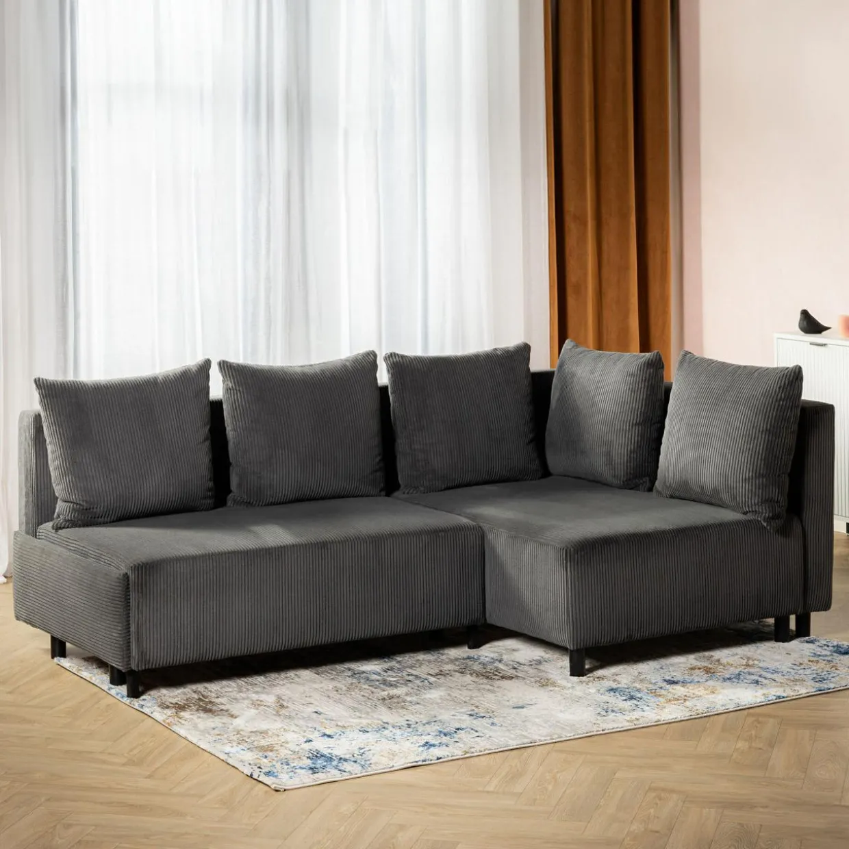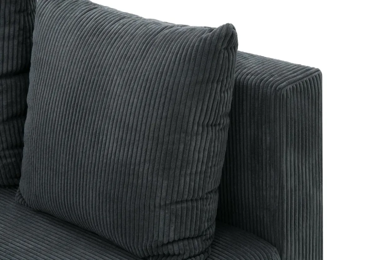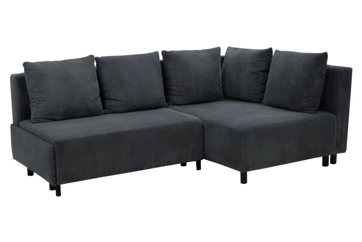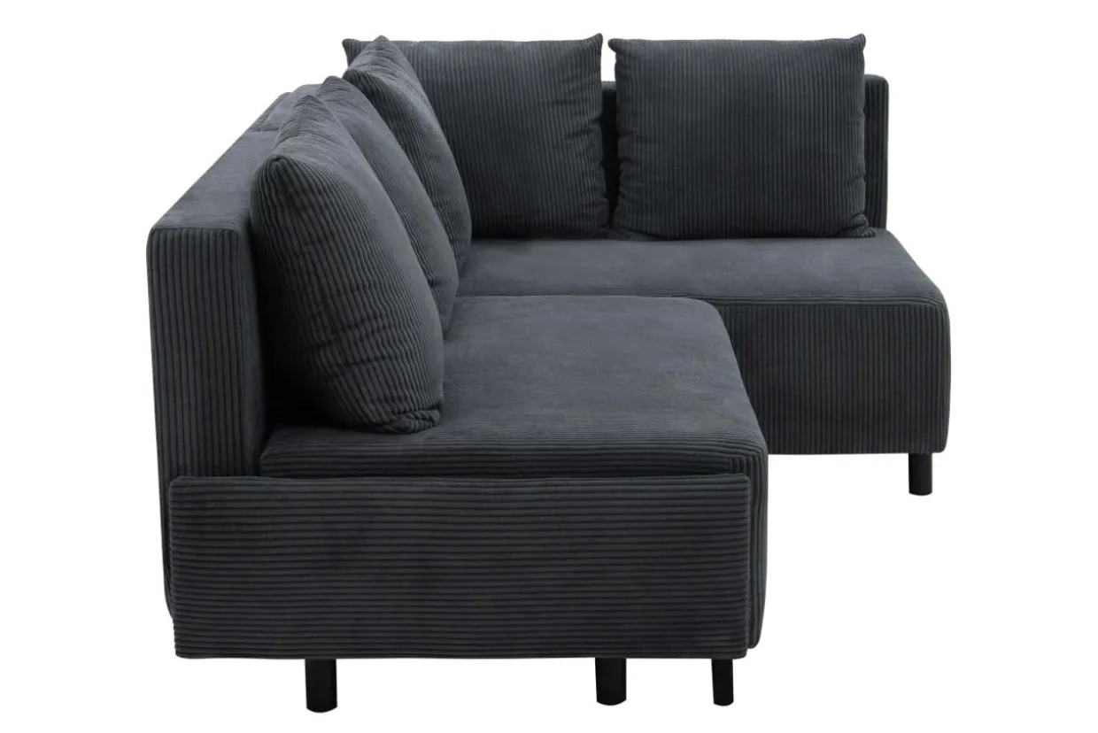 Narożnik w szarym kolorze przyciąga wzrok miękką, sztruksową tapicerką.