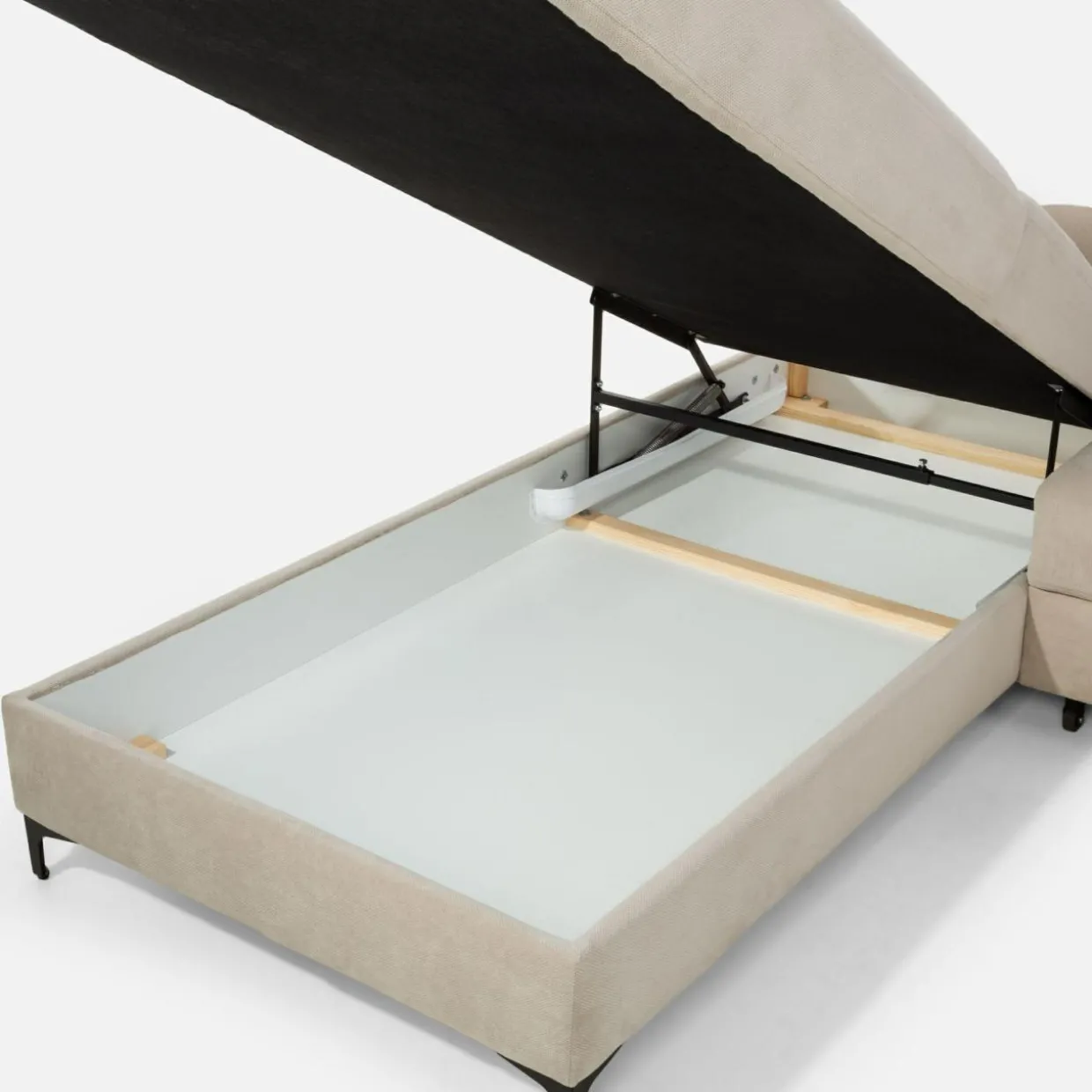 Stelaż pod siedziskiem wysuwamy i podnosimy za pomocą uchwytu. Mebel nie wymaga odsuwania od ściany. Idealny do okazjonalnego spania.