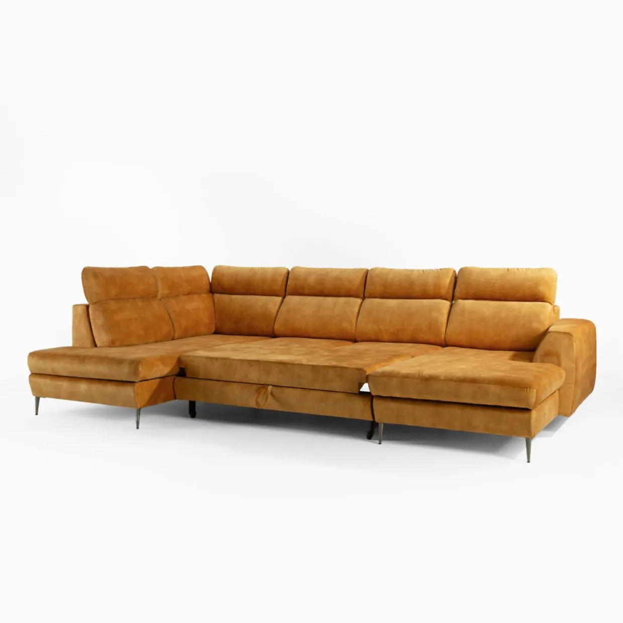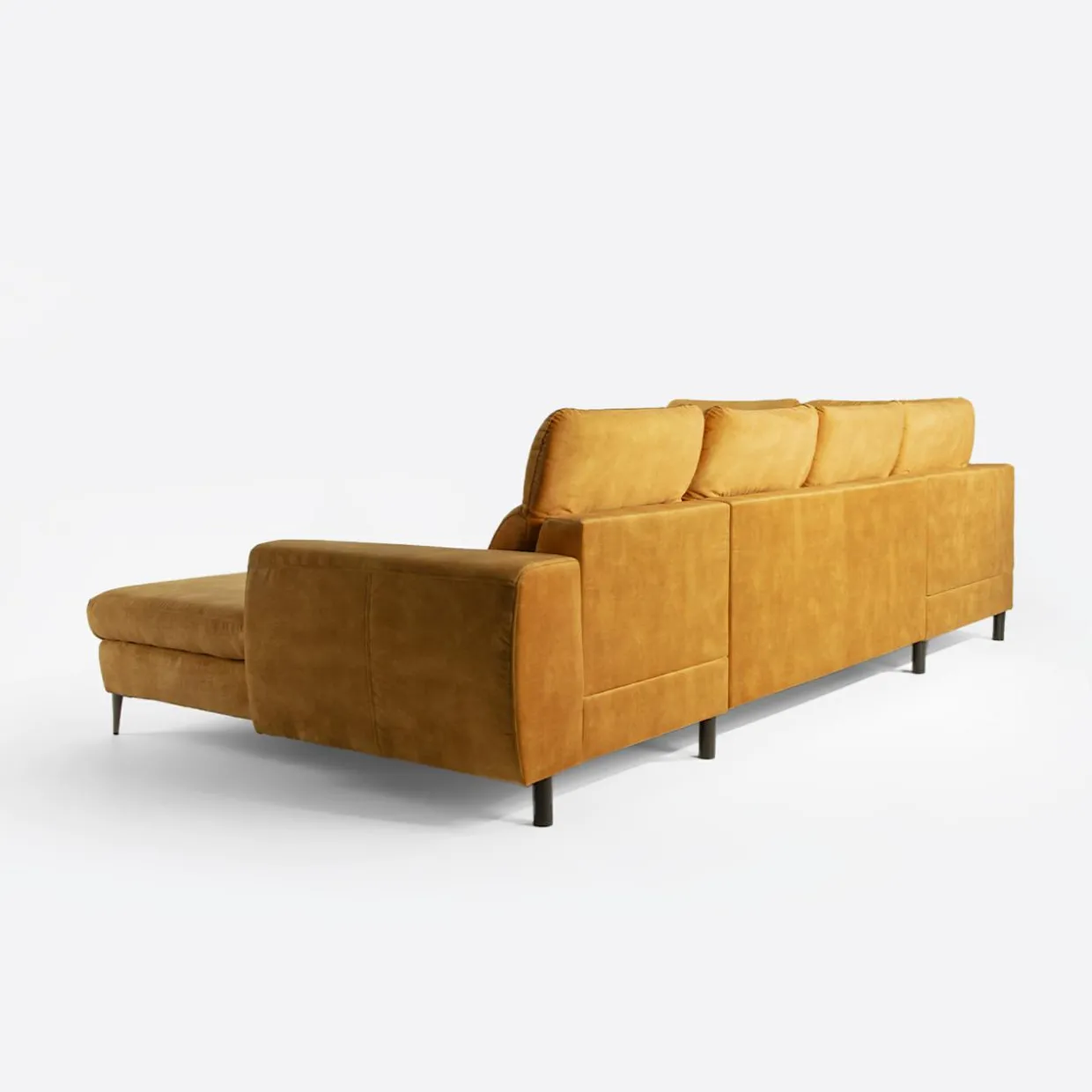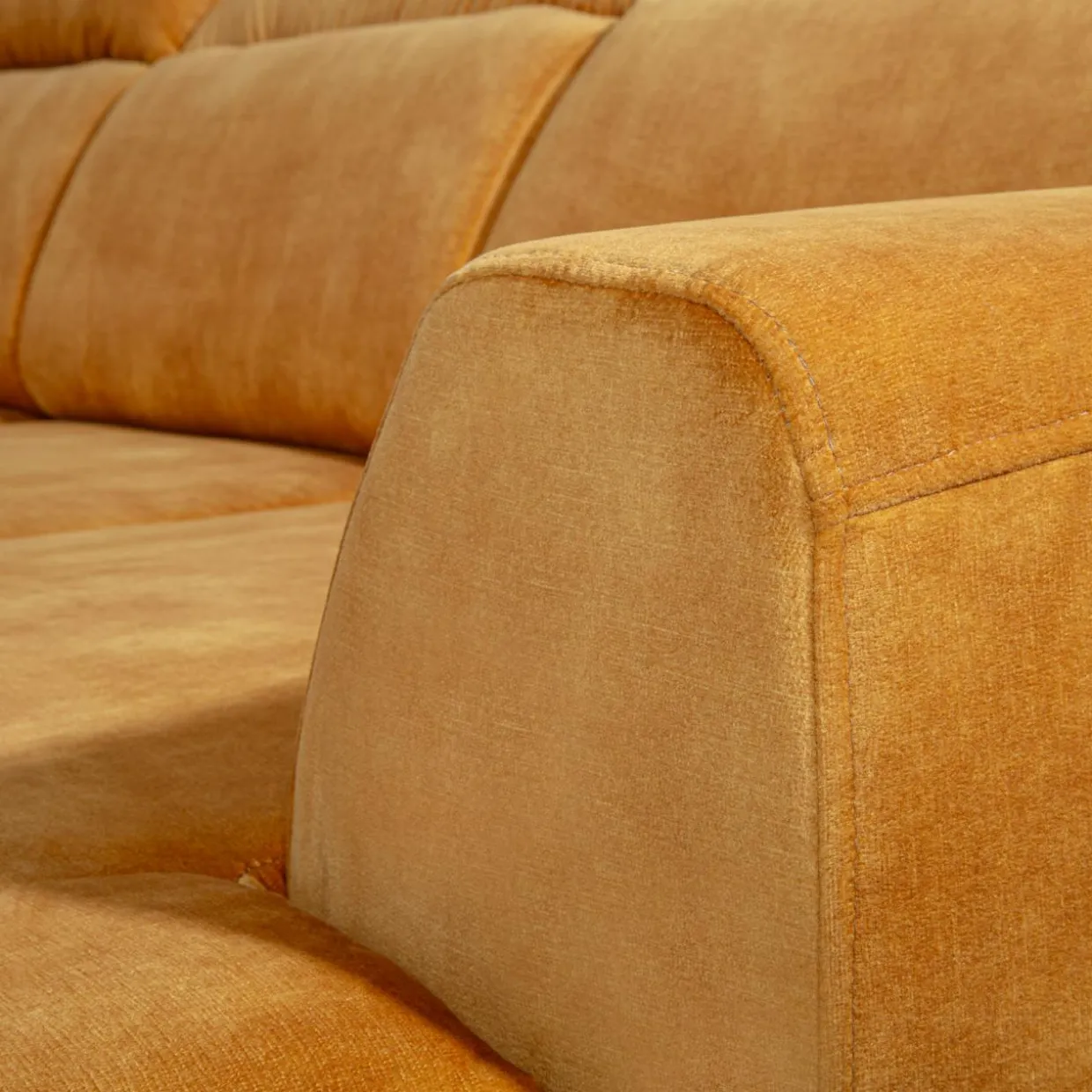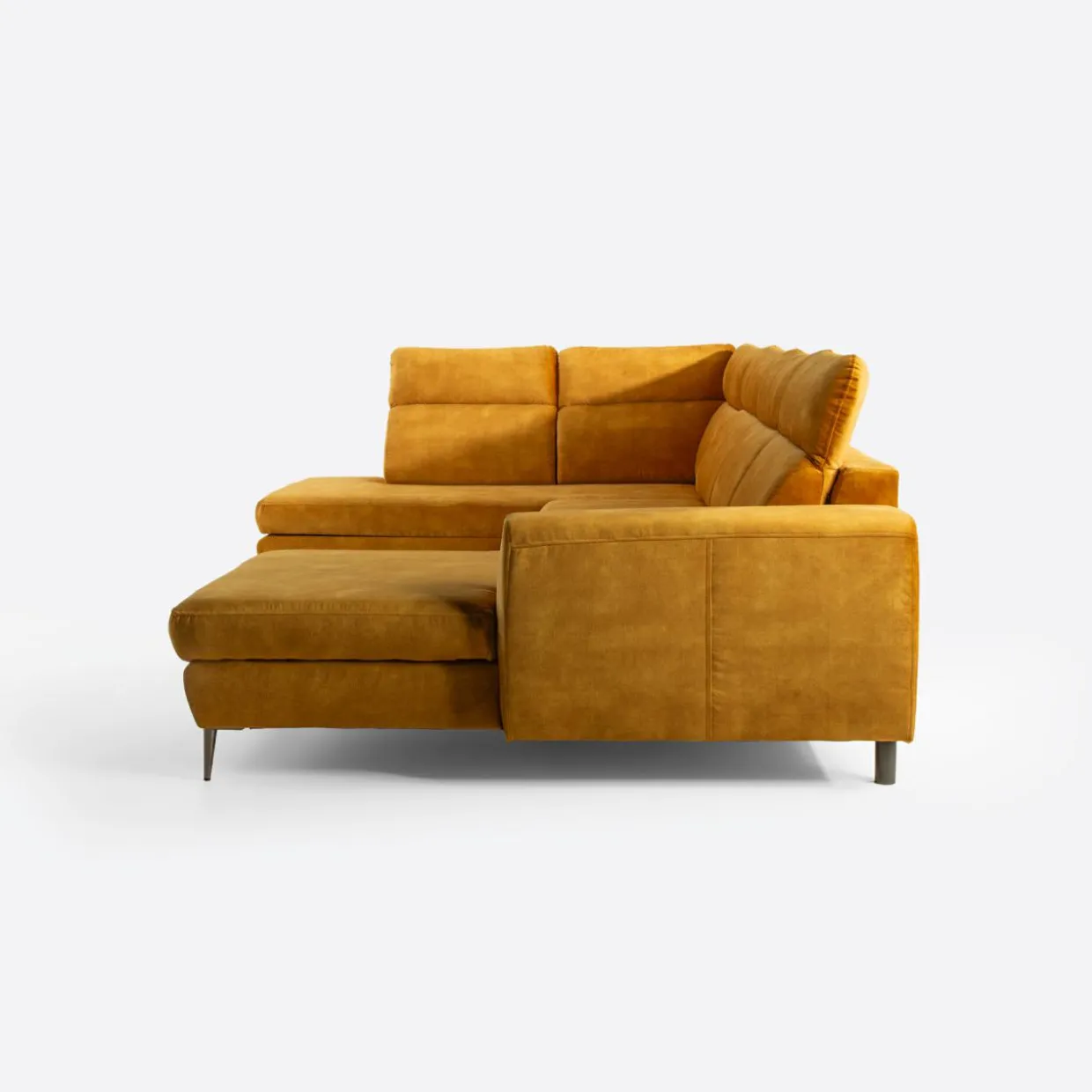 Zastanawiasz się jak stworzyć przytulną aurę w przestronnym salonie? Narożnik DAKOTA pokryto welurem w energetyzującym, musztardowym odcieniu, który dopełni jasne wnętrze, dodając mu wyrazu.