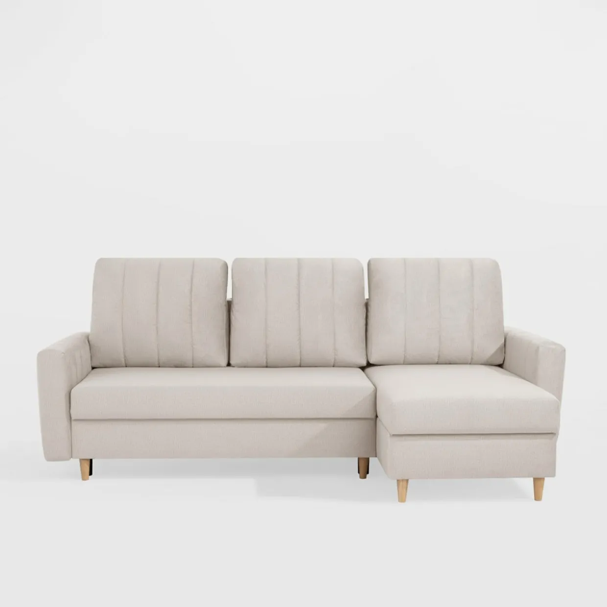Narożnik MASIMO pokryto tkaniną w drobną, beżową plecionkę. Przyjemny w dotyku materiał będzie, który umili popołudniowy wypoczynek w salonie.