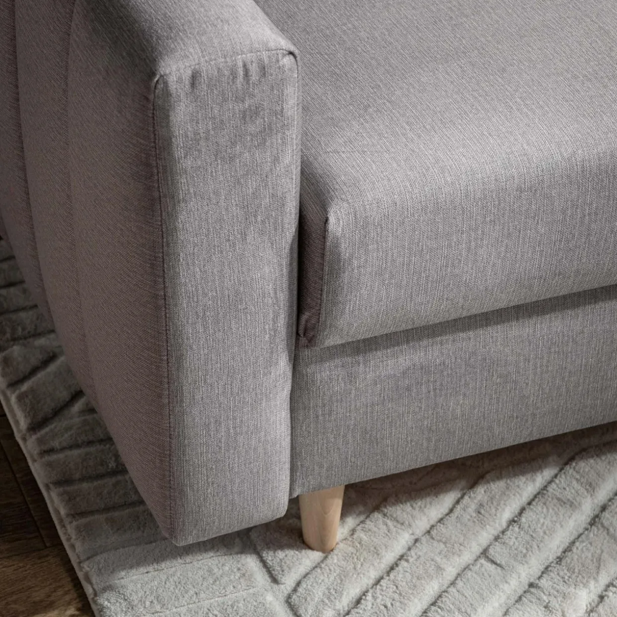 Narożnik MASIMO pokryto tkaniną w drobną, szarą plecionkę. Przyjemny w dotyku materiał, umili popołudniowy wypoczynek w salonie.
