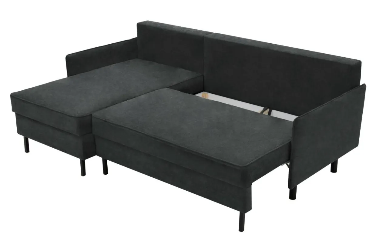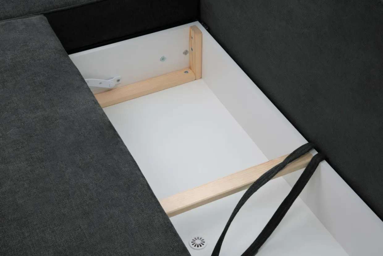 - 1 pojemnik znajduje się pod siedziskiem – to idealne miejsce na pościel, bo dostaniesz się do niej podczas rozkładania narożnika.