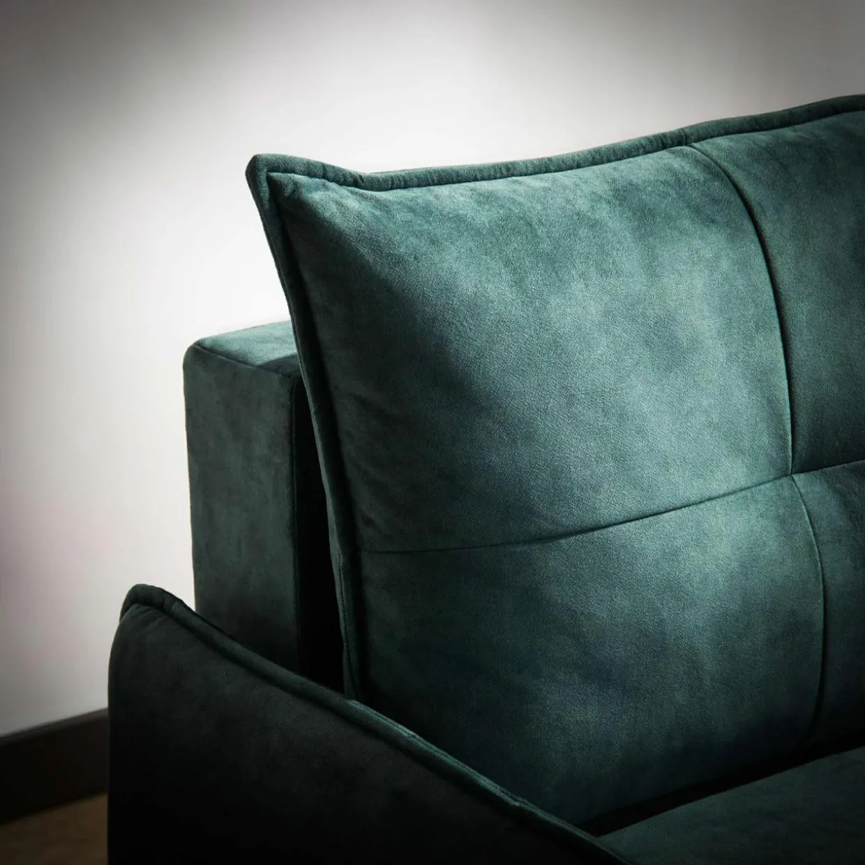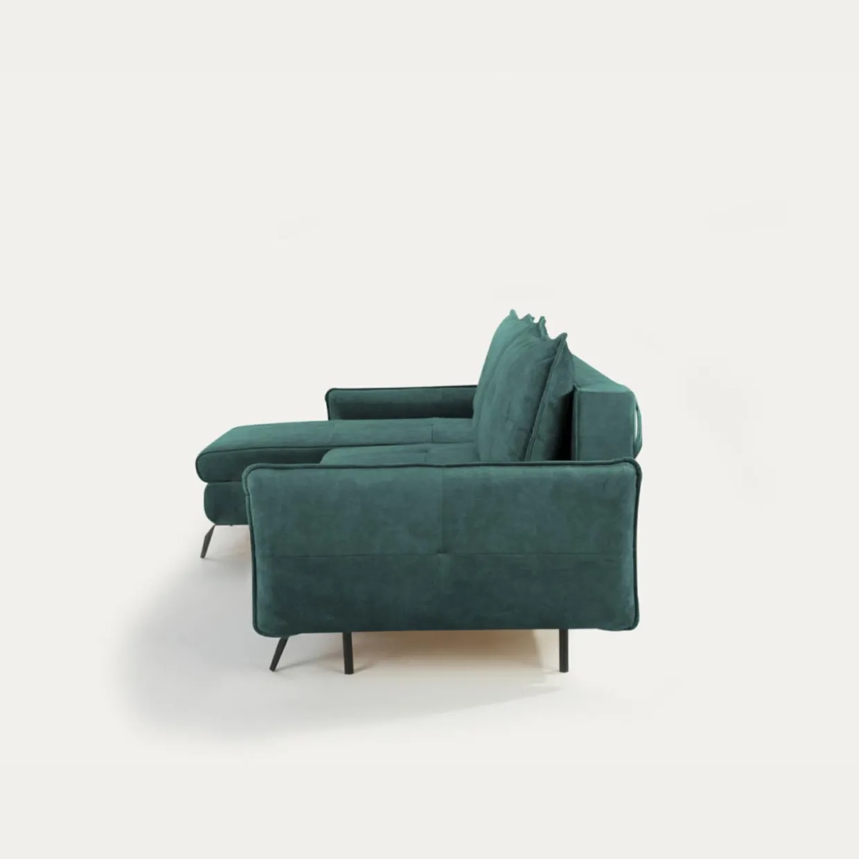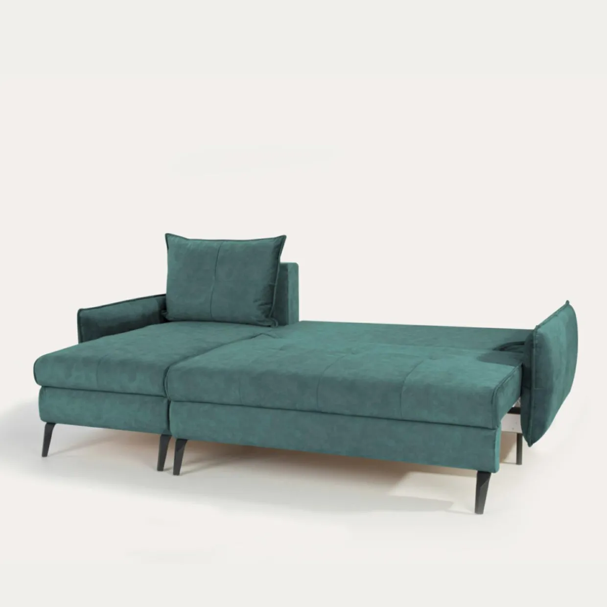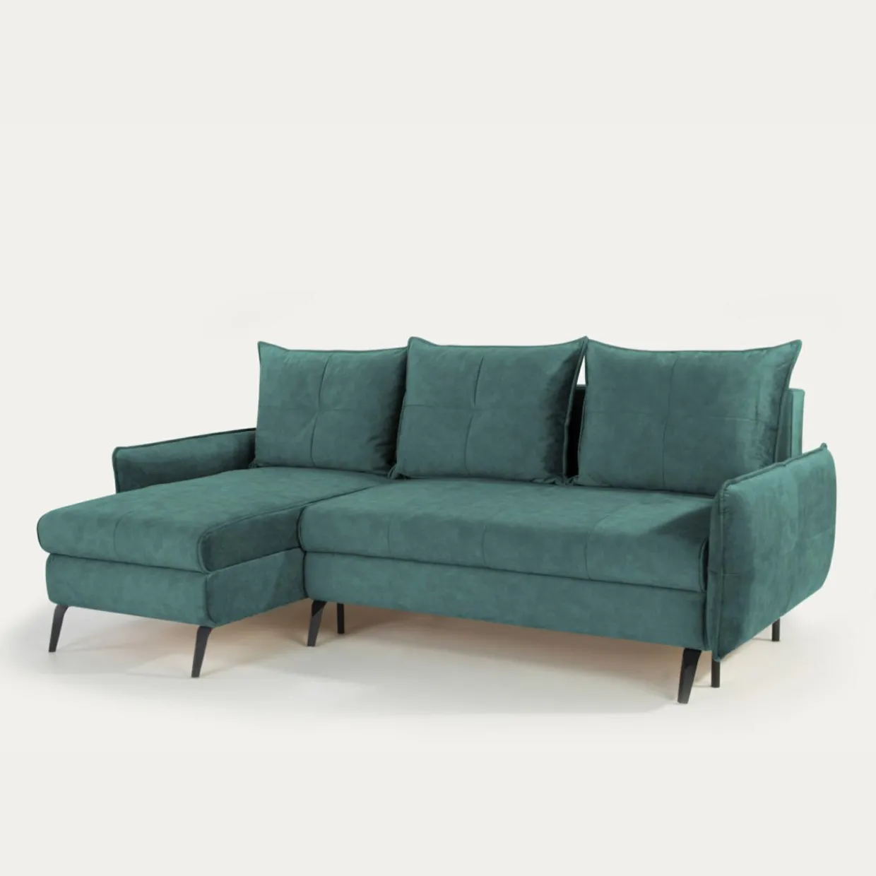 - Narożnik został pokryty miękką, welurową tkaniną TERRA w turkusowym kolorze.