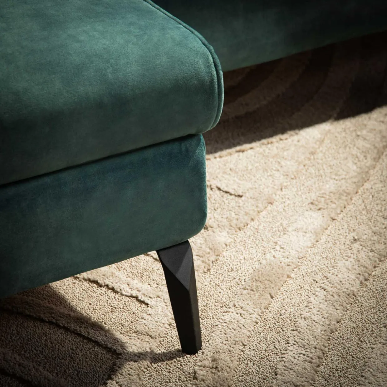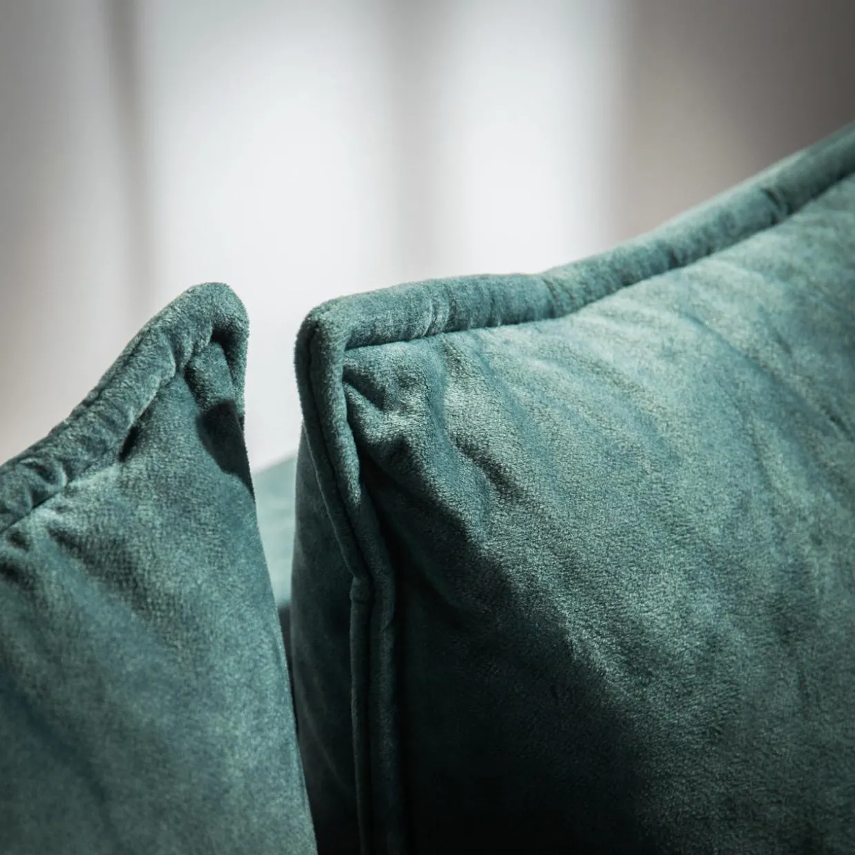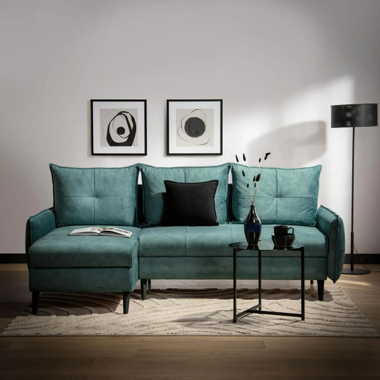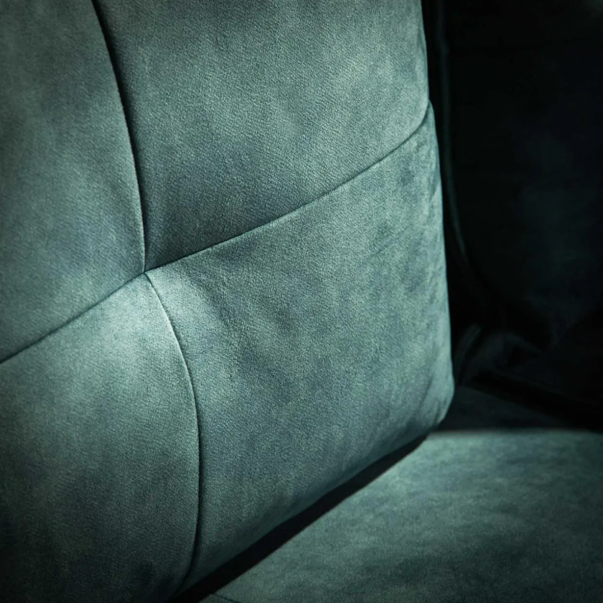 - Narożnik został pokryty miękką, welurową tkaniną TERRA w turkusowym kolorze.