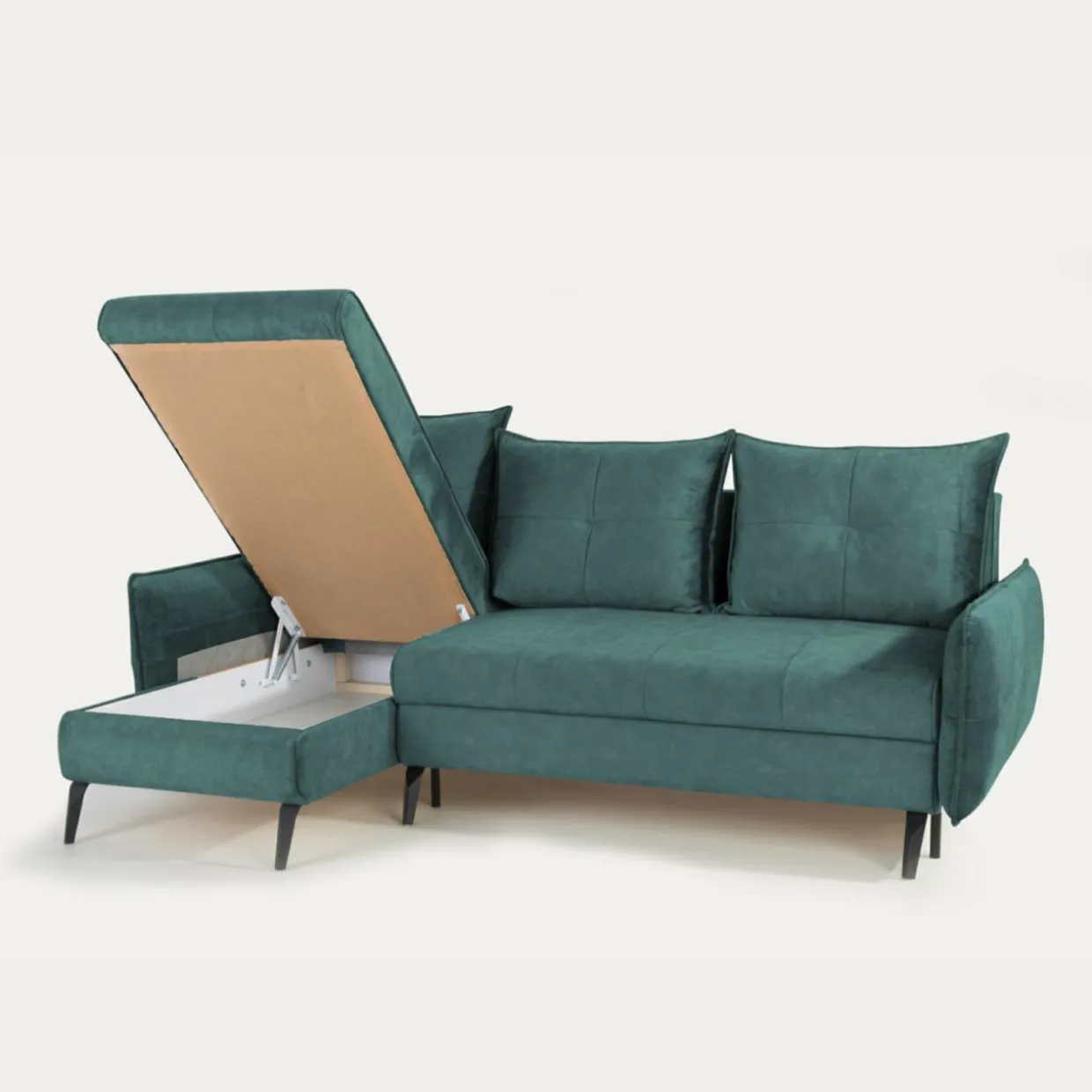- Pojemnik w otomanie idealnie posłuży jako miejsce na komplet pościeli i inne domowe tekstylia. Możesz otworzyć pojemnik, nawet gdy narożnik jest rozłożony.