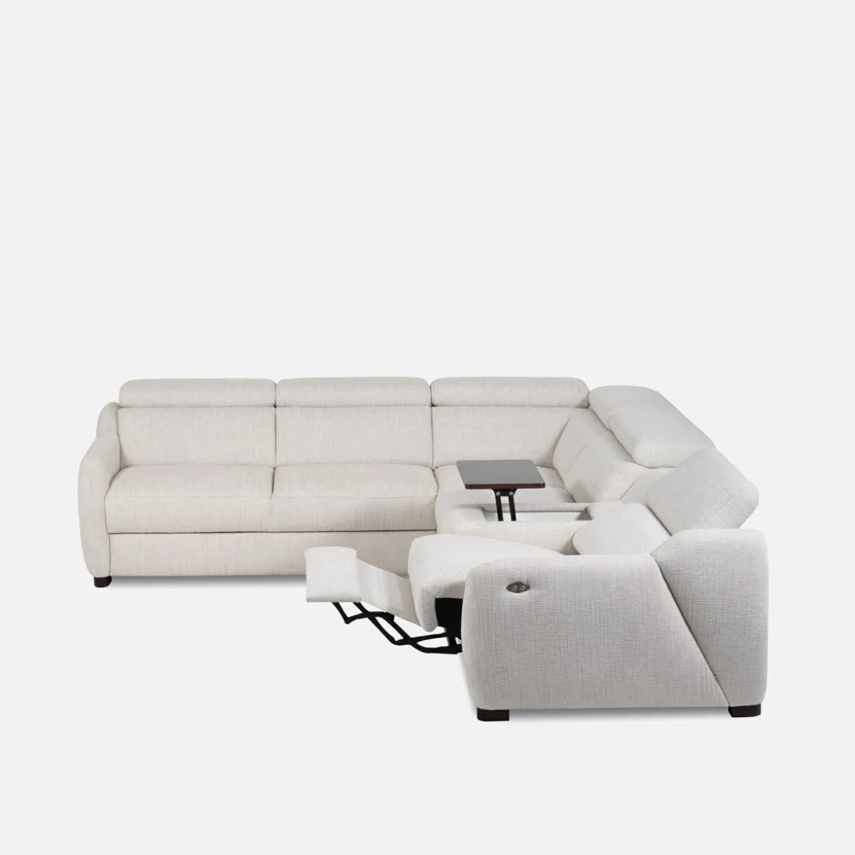 - Narożnik wyposażony jest w fotel z elektryczną funkcją relaks, która pozwala rozsiąść się wygodnie w pozycji półleżącej — idealnej do oglądania filmów, czytania książek lub po prostu relaksu.