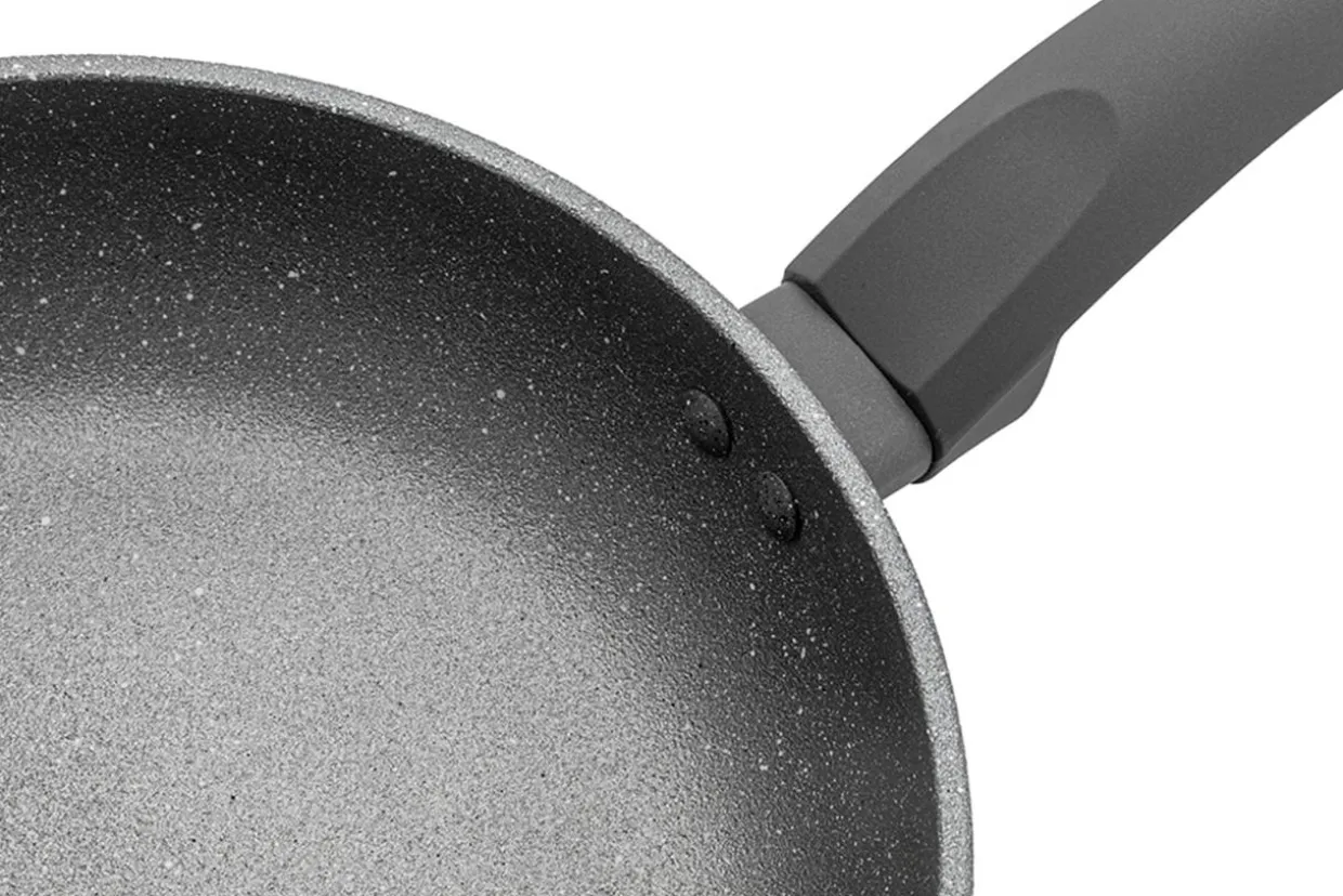 Głęboka patelnia z kolekcji LAVA STONE wykonana została z wysokiej jakości tłoczonego aluminium, pokrytego powłoką nieprzywierającą z drobinkami piasku, imitującą kamień.