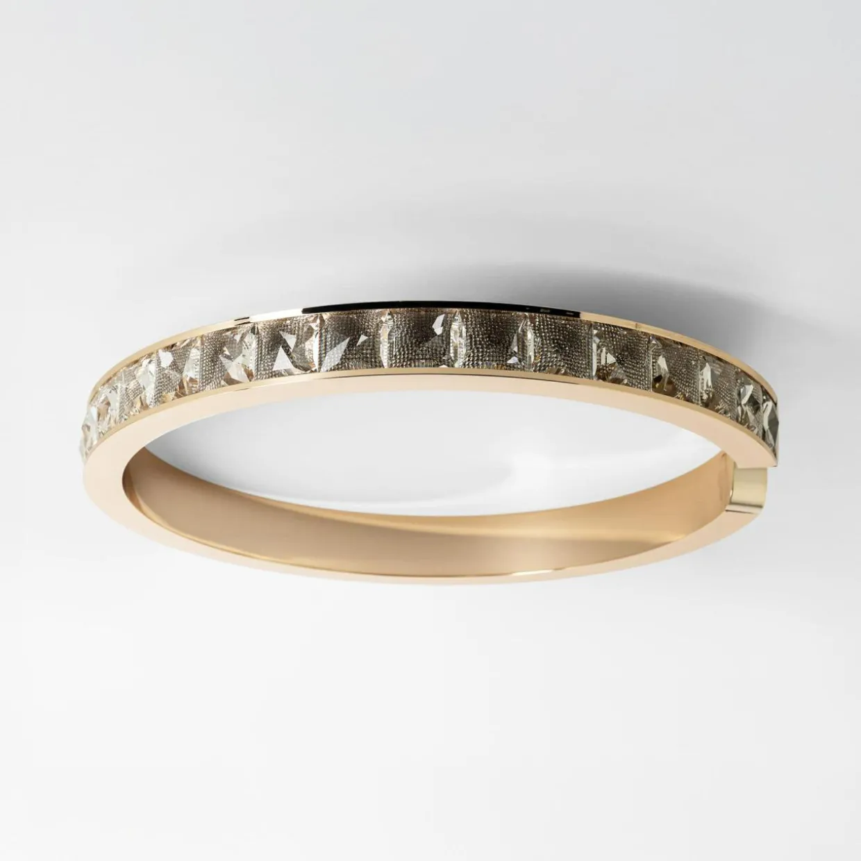 - Jego design przypomina złoty pierścień lub obręcz, w której akrylowe kryształki dodają blasku na podobieństwo drogich kamieni.