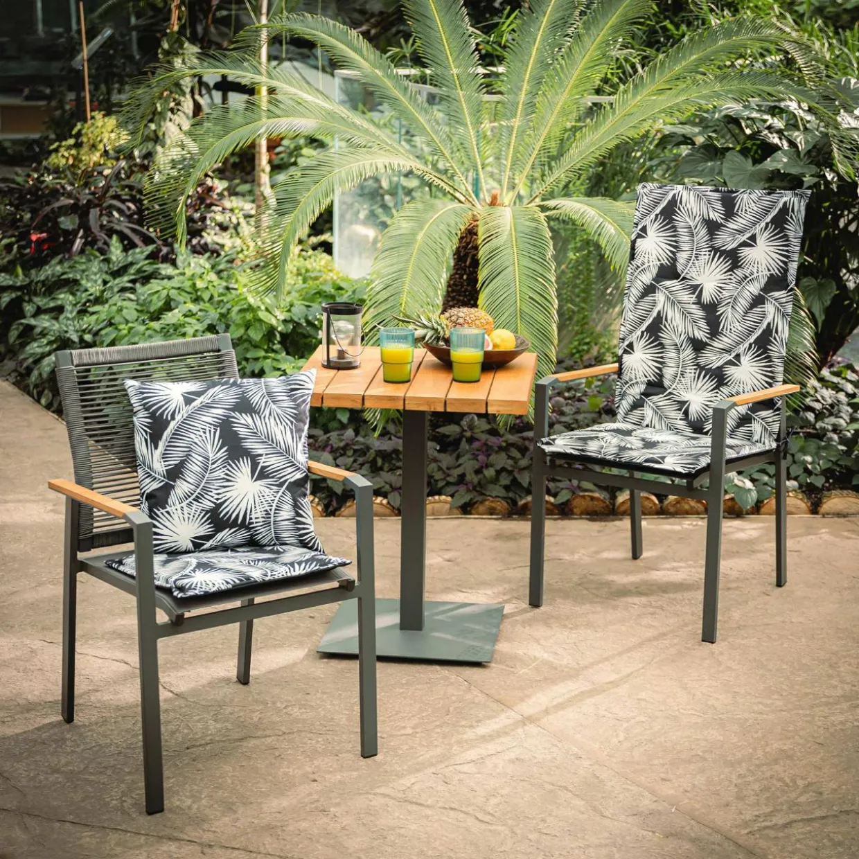 - Wzór z palmowymi liśćmi przeniesie Cię w egzotyczne, wakacyjne klimaty, a klasyczne zestawienie czerni i bieli przyciągnie wzrok i doda przestrzeni szyku.