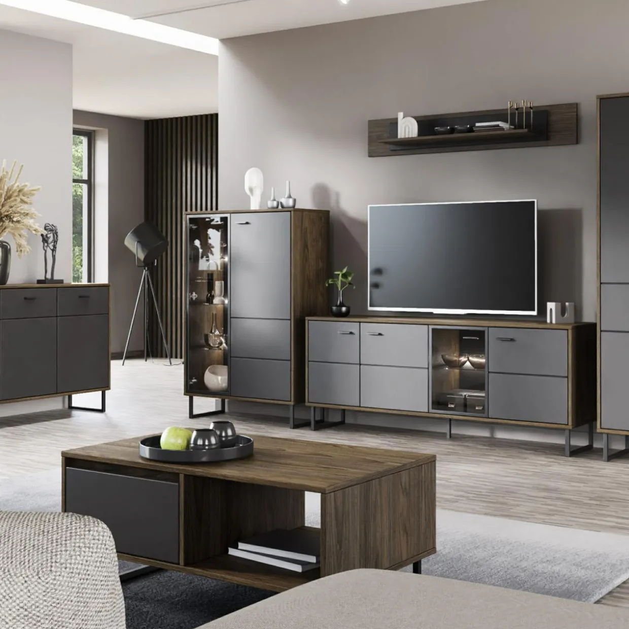Kolekcję mebli LOZANNA cechuje minimalizm. Prosty kształt bryły w odcieniu ciemnego dębu i szarości oraz metalowe geometryczne nogi dadzą we wnętrzu elegancki i stonowany efekt.