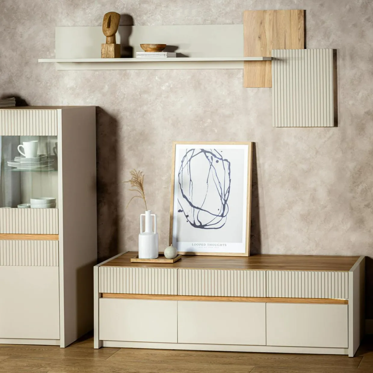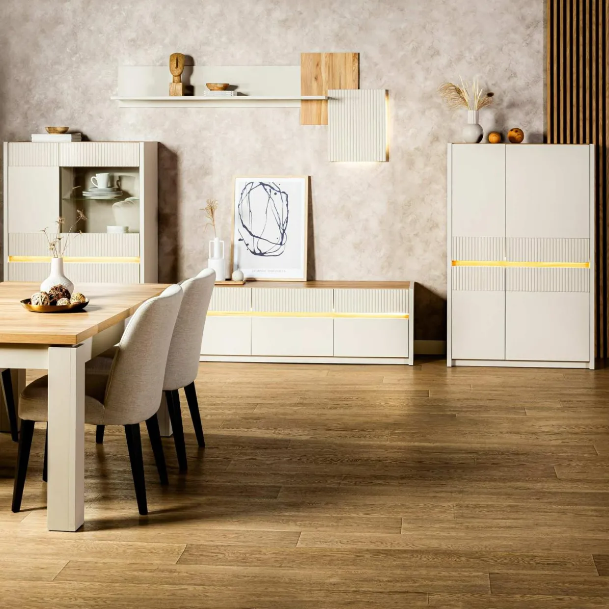 Stwórz przytulny salon z meblami z kolekcji OAK SQUERE. Piaskowy beż w połączeniu z jasną kolorem drewna nadadzą wnętrzu łagodny charakter, który wprowadzi Cię w relaksujący nastrój. Beżowe meble rozjaśnią wnętrze i sprawią, że pomieszczenie wyda się bardziej słoneczne i przestronne.