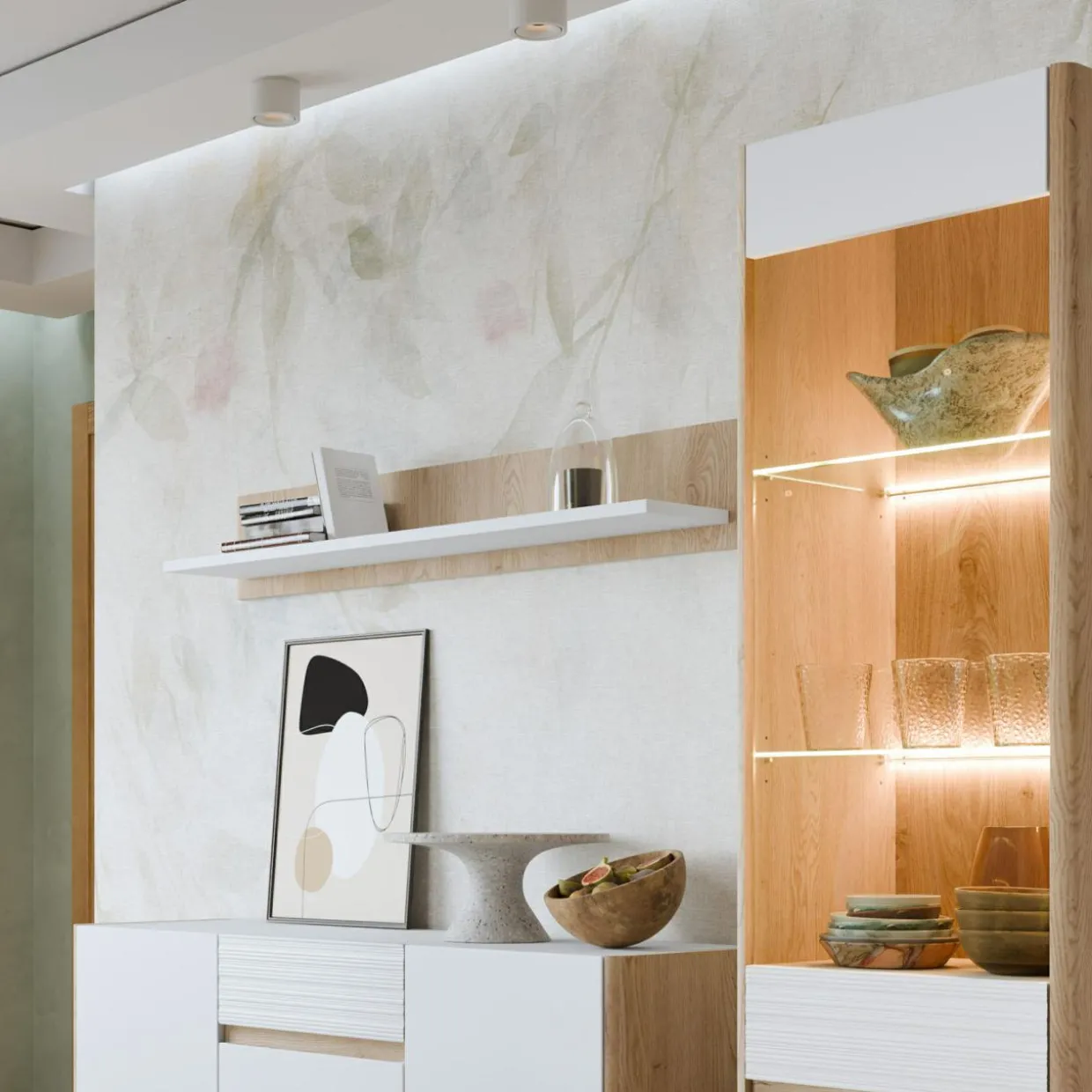 Meble w kolorach dębu Cremona i bieli Alpin, które wprowadzają świeżość i nowoczesny styl do wnętrz. Praktyczne układy sprawiają, że sprawdzą się w salonie, sypialni czy jadalni. Łączą estetykę jasnego drewna z minimalistycznym wzornictwem, podkreślając charakter przestrzeni.