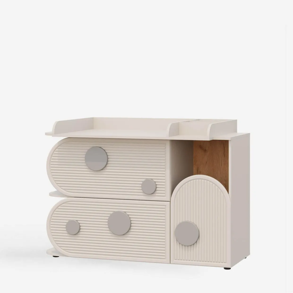 - Delikatne ryflowanie i szare elementy dekoracyjne świetnie wpiszą się w nowoczesne wnętrze, a także podkreślą dziecięcą kreatywność.