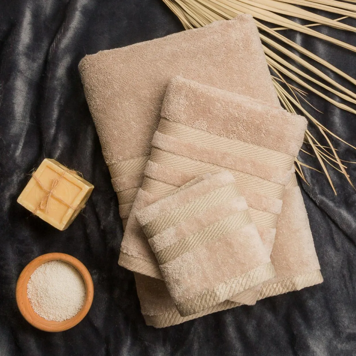 - Beżowy ręcznik pięknie zaprezentuje się minimalistycznej łazience.